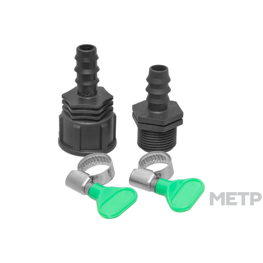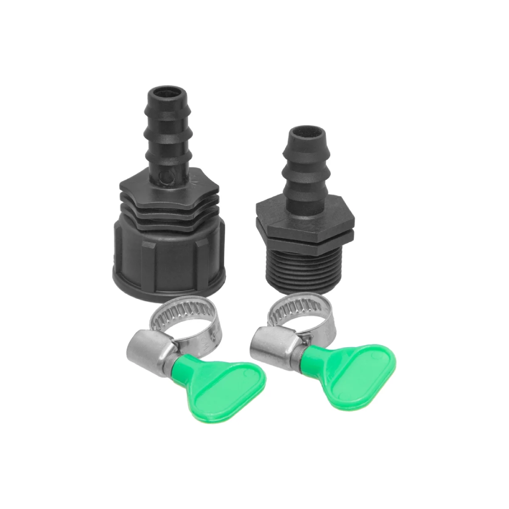 Набор для подключения таймера капельного полива к системе. Набор универсальный и подходит к таймерам любых производителей. В него входит два пластиковых штуцера на резьбу 3/4 (один с наружной резьбой,другой с внутренней) для перехода с резьбы таймера на шланг либо ПНД трубку диаметра 16мм и два хомута с бабочкой для надежного и гермитичного соединения штуцера и шланга.