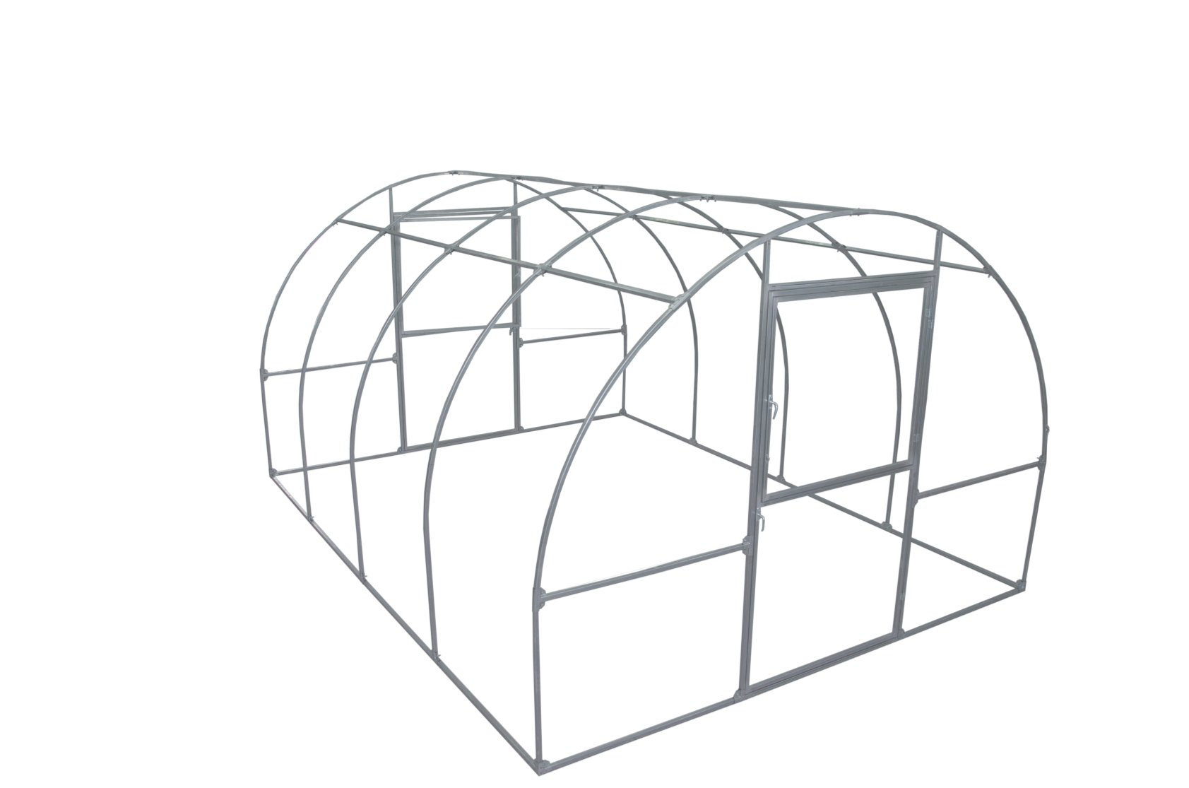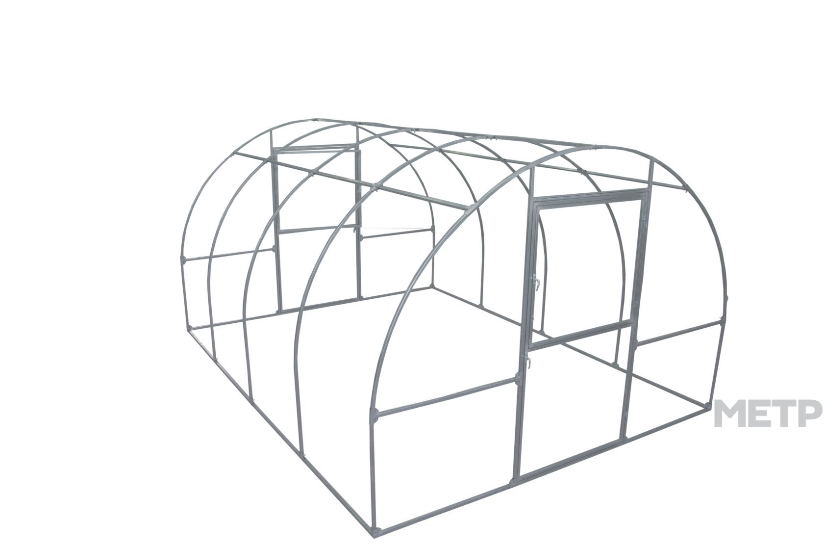Каркас теплицы "Эталон-Стандарт" сделан из оцинкованной квадратной трубы сечением 20х20, расстояние между дугами 1 метр, дуги скреплены 7 продольными перемычками. Ширина каркаса 3 метра, высота 2,1 метра. Дуги и перемычки скреплены между собой краб-системой. Каркас имеет две двери шириной 1 метр (с каждой из сторон), на каждой двери имеется форточка для проветривания. Двери и форточки снабжены удобными ручками для открывания, а также крючками для фиксирования.