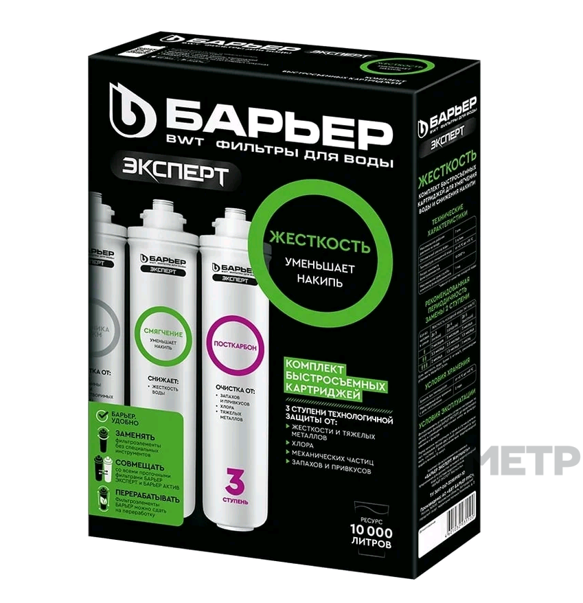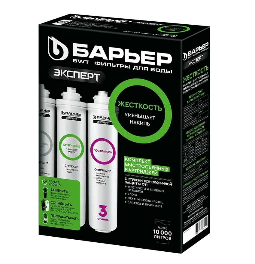 Комплект картриджей для фильтра под мойку БАРЬЕР ЭКСПЕРТ Жесткость, защищает от накипи Р223Р00 предназначен для специализированной очистки воды с повышенным содержанием солей жесткости.