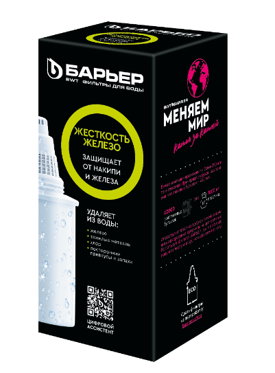Сменная кассета для фильтра БАРЬЕР Жесткость Железо работает комплексно: снижает жесткость, которую мы привыкли встречать в жизни в виде накипи, удаляет из воды растворенное железо и неприятный металлический привкус, а также, как и все кассеты БАРЬЕР, очищает от хлора, тяжелых металлов и других вредных примесей. Результат – чистая вода без накипи, рыжеватого осадка и неприятного привкуса. Ресурс кассеты — 350 литров.