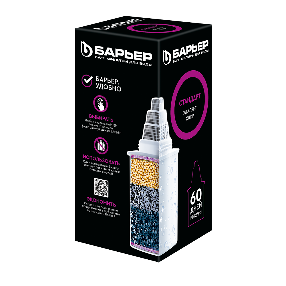 Кассета сменная Барьер Стандарт содержит компоненты, которые очищают воду от твердых частиц и вредных примесей, за счет активированного угля в составе. Имеет большой ресурс в 350 литров.