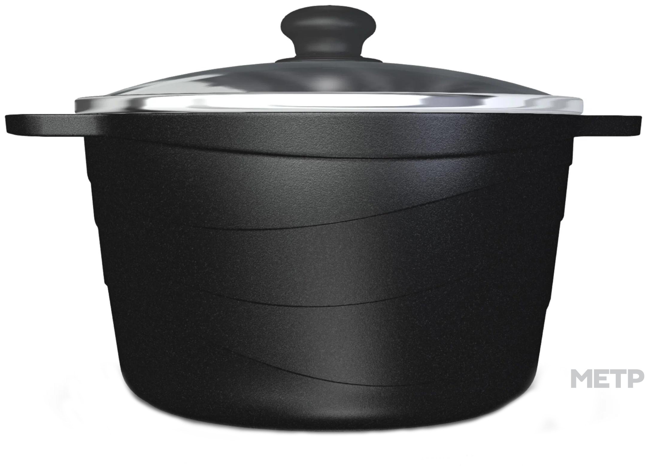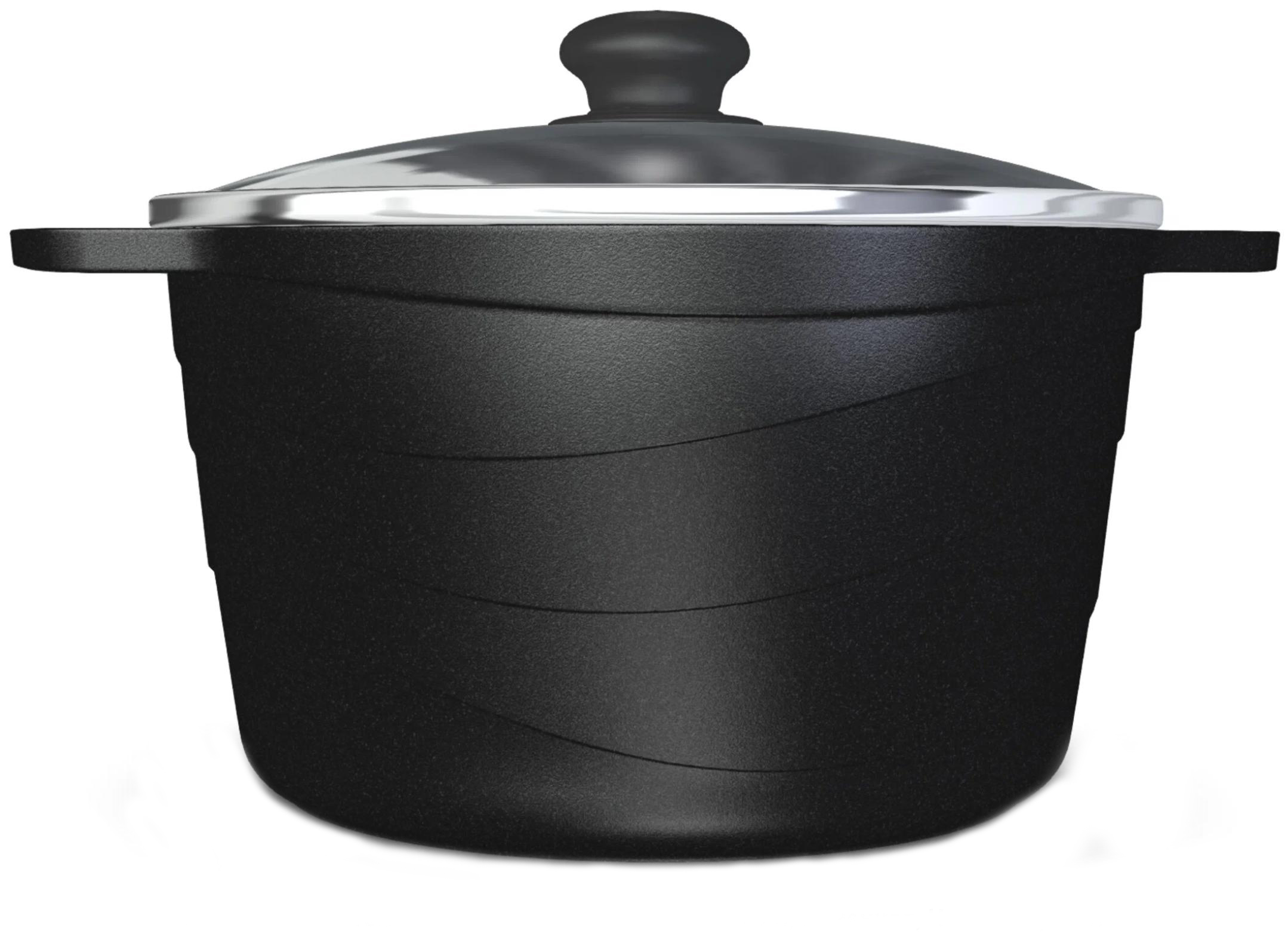 Кастрюля имеет современный прямой корпус из литого алюминия с уникальным геометрическим рисунком волна. Качественное антипригарное покрытие с эффектом натурального камня Черный гранит позволяет избежать пригорания продуктов даже без использования масла. Покрытие на водно-кремниевой основе не содержит PFOA (перфтороктановую кислоту), безопасно для контакта с пищевыми продуктами, а также в производстве и для окружающей среды. Изделие подходит для всех типов плит, кроме индукционных.