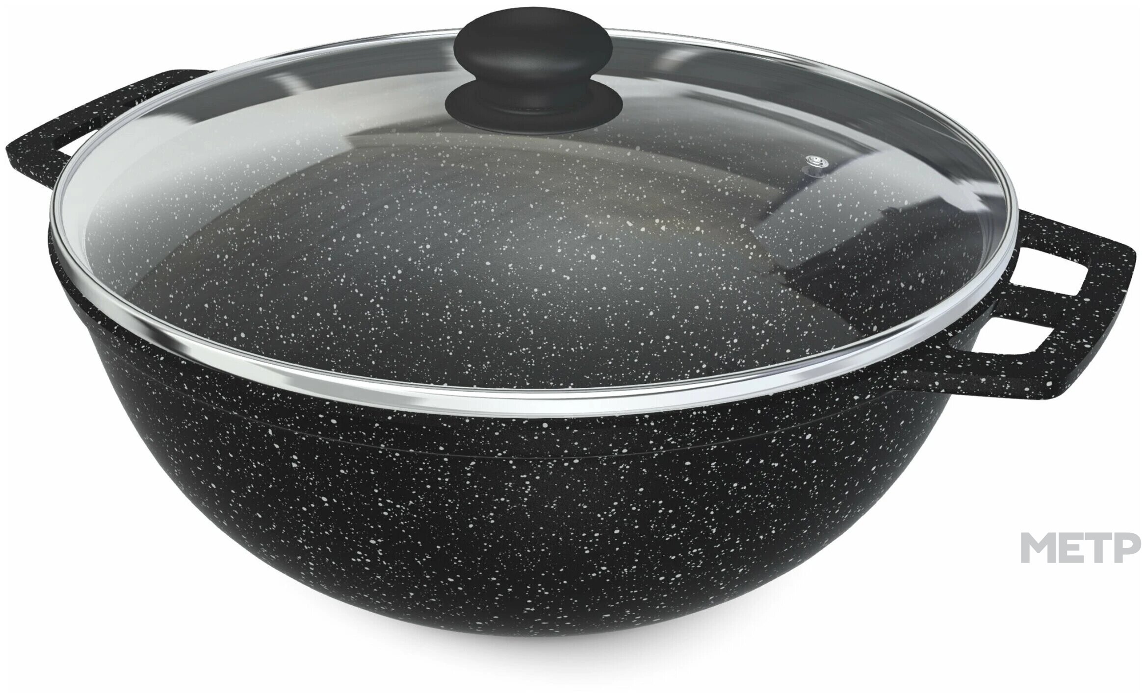 Глубокий казан с декоративным покрытием со стеклянной крышкой многофункционален и удобен в эксплуатации, в нем можно жарить, тушить, томить и варить. Утолщенное дно и толстые стенки создают эффект томления, как в чугунной посуде, сохраняя вкусовые качества и полезные свойства продуктов. Литой алюминиевый корпус не подвержен деформации и обеспечивает равномерный нагрев. Подходит для всех типов плит, кроме индукционных.