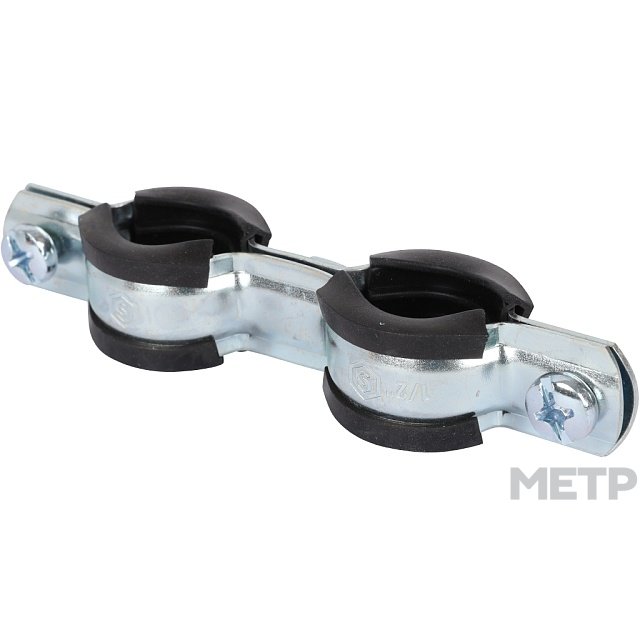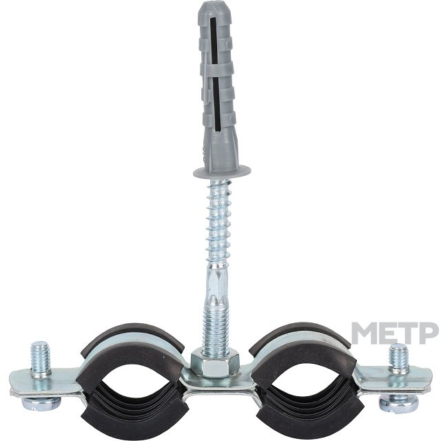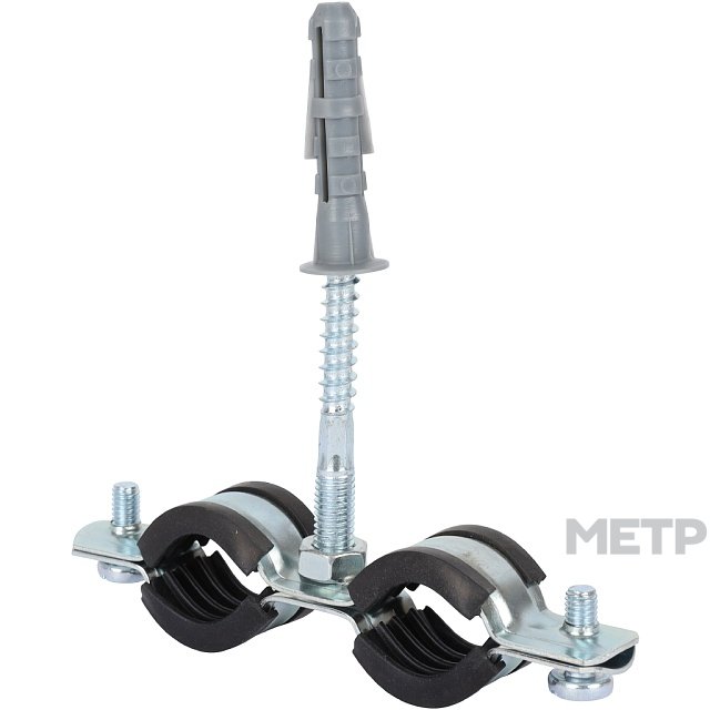 Двойной хомут для труб STOUT — это комплект, включающий в себя хомут, шпильку-шуруп и дюбель пластиковый. Этот набор предназначен для надёжного крепления труб диаметром от 15 до 19 мм.