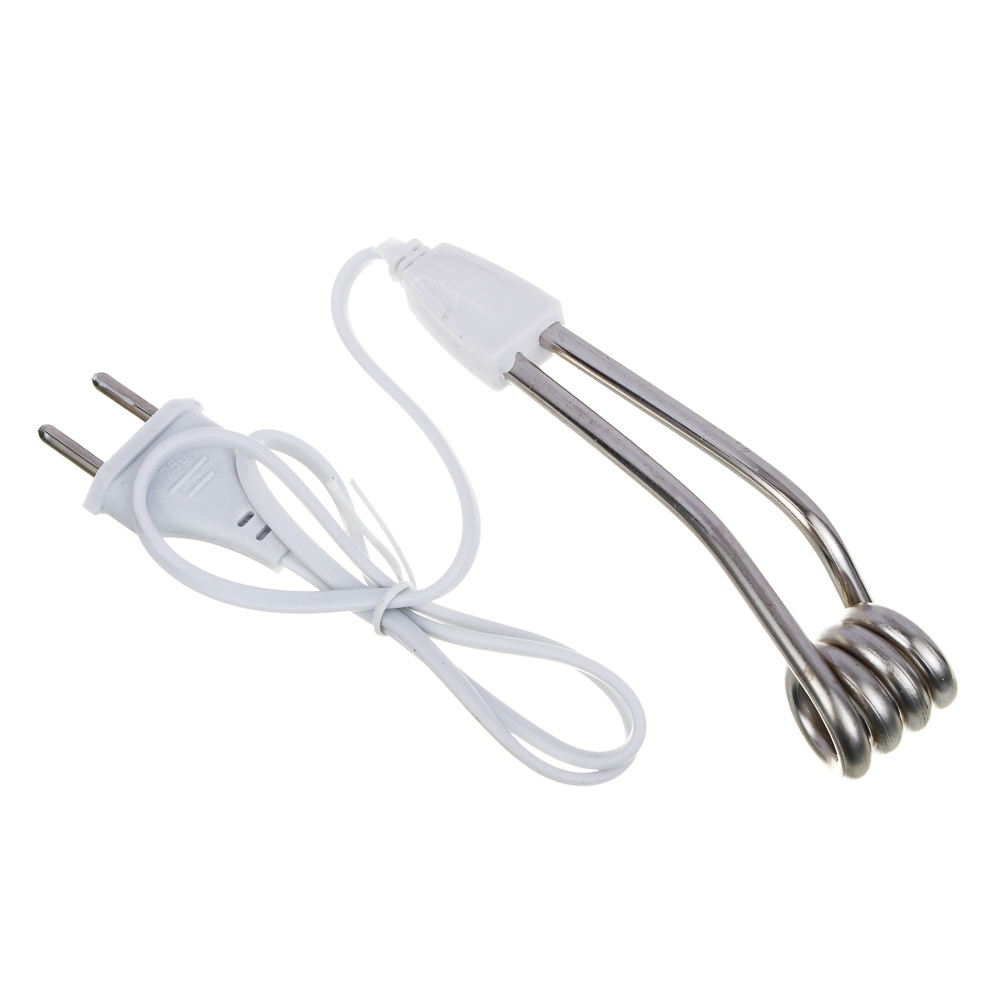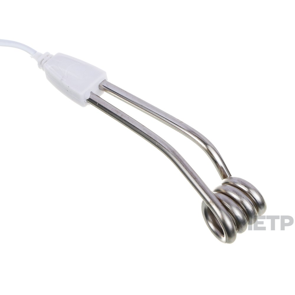Кипятильник (500Вт). Модель малой мощности, рассчитана на использование в дороге, компактна. Материал – металл+пластик, длина шнура 65 сантиметров. Простое обиходное изделие, которое способно нагреть малые объемы воды достаточно быстро. Пригодится, когда отсутствуют условия для подключения приборов большей мощности.