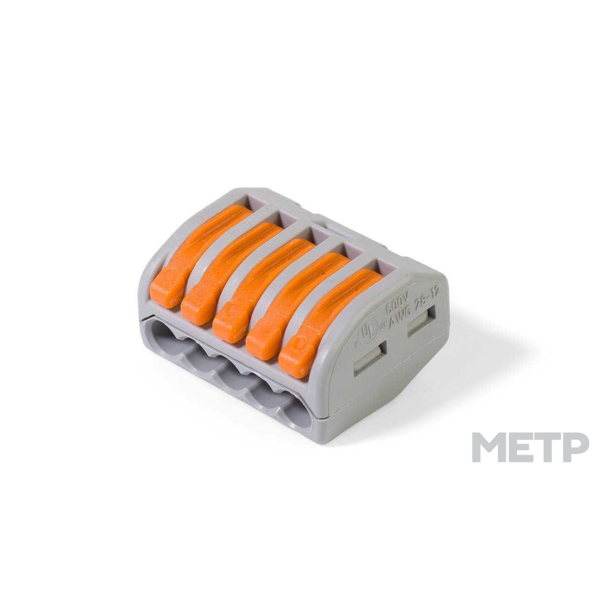 Клемма быстрозажимная с рычажком WAGO 222-415 4 кв. мм 5-проводная — универсальная изолированная клемма для подключения любых типов медных проводников: однопроволочных и многопроволочных. Зажим проводов в клемме осуществляется при помощи оранжевых рычагов. Наличие специального паза в корпусе для размещения рычага в закрытом положении надежно предотвращает случайное отсоединение проводника. Специальное отверстие дает возможность измерения электрических параметров цепи без разбора и нарушения изоляции соединения. Для монтажа не требуется дополнительных инструментов. Используя быстрозажимные клеммы с рычажком WAGO вы обеспечиваете безопасность и порядок в распределительной коробке.