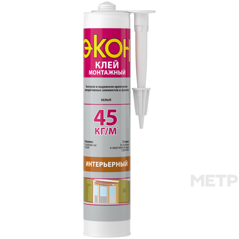 Клей монтажный Экон интерьерный белый 400 гр - монтажный клей для фиксации декоративных и отделочных элементов из дерева, МДФ, ПВХ и др. , а также крепения плинтусов и фризов. Устойчив на отрыв. Устойчив к вертикальным сдвигам.