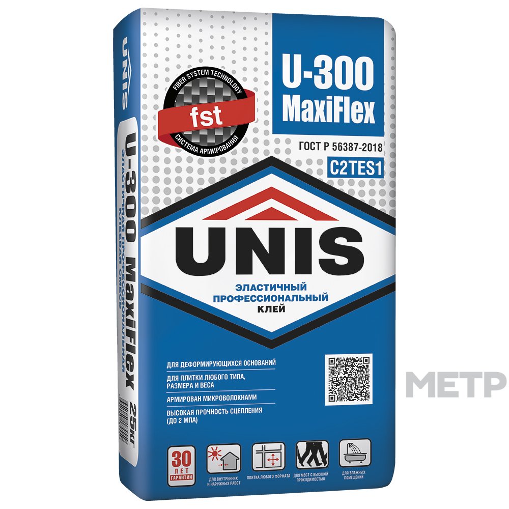 Клей для керамогранита U300 MaxiFlex Юнис , 25кг Применяется для внутренних и наружных работ при облицовке стен и полов в квартирах, магазинах, для облицовки фасадов, балконов, террас, цоколей и бассейнов. Подходит для поверхностей, подверженных деформационным нагрузкам: входные группы в здание, лестничные марши и площадки, промышленные цеха и складские зоны, паркинги, промышленные полы, ж/д вокзалы, подземные переходы, станции метро, аэропорты и т.д. Применяется для облицовки нагреваемых поверхностей: теплых полов, печей и каминов до +120°C.