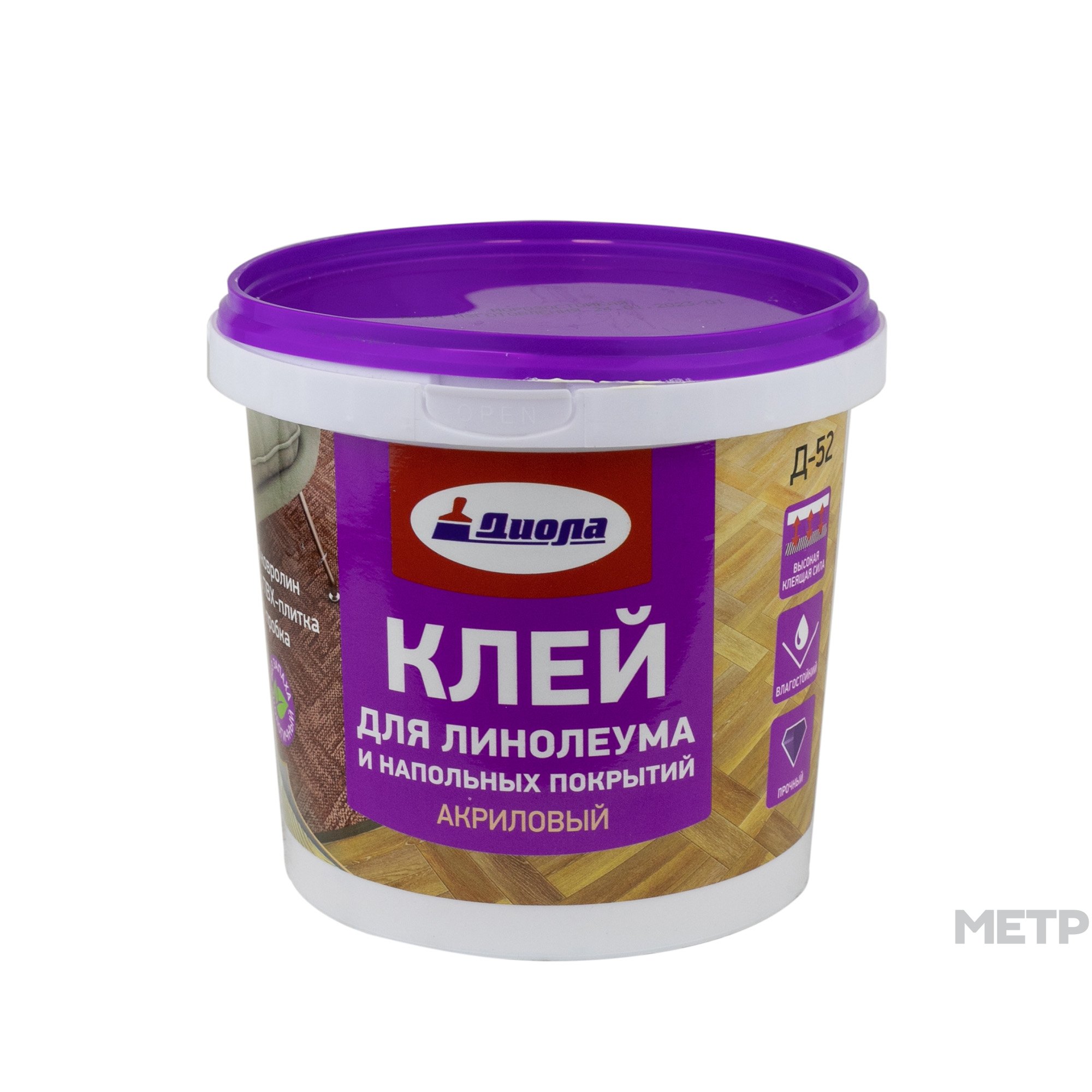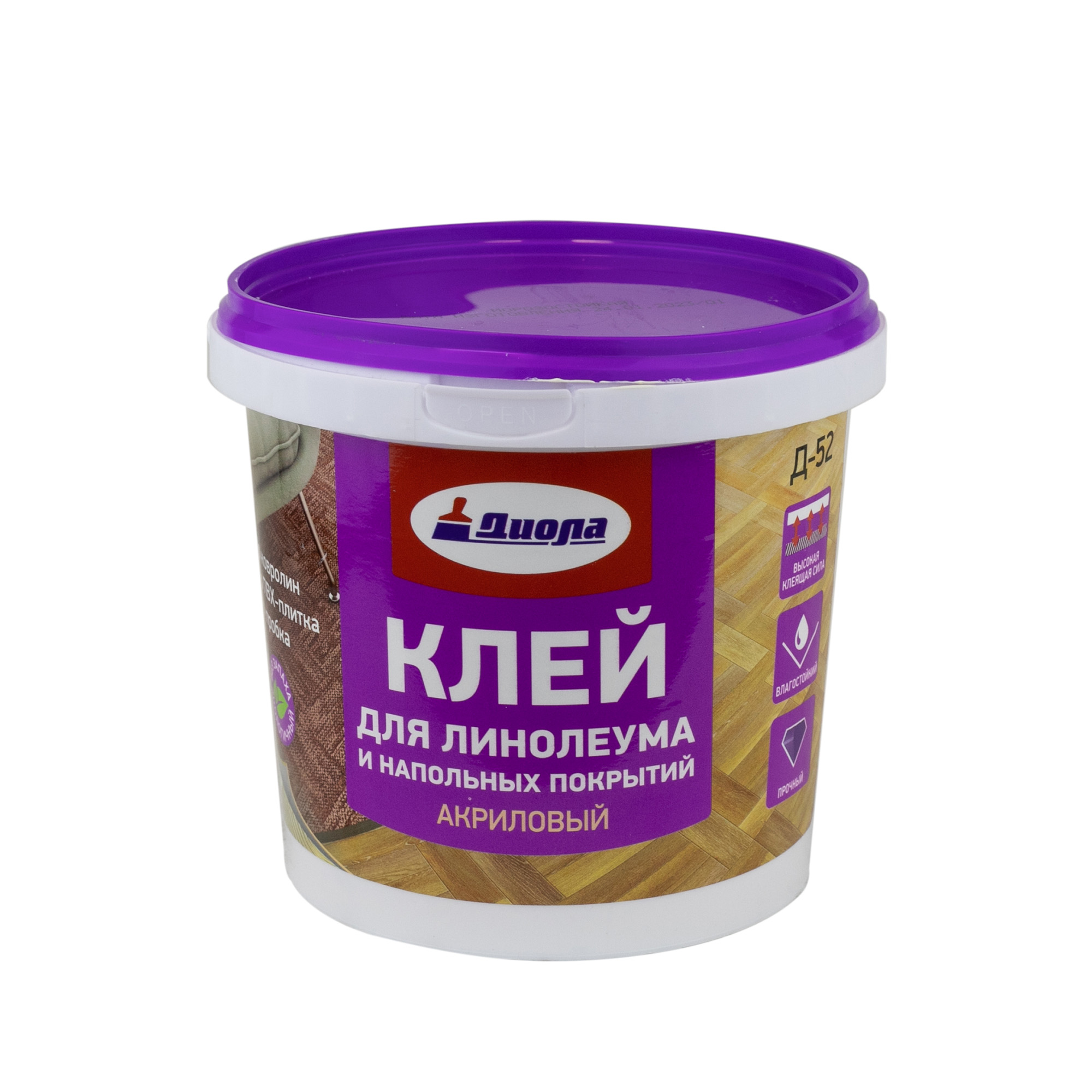 Клей для напольных покрытий Диола акриловый 1,5 кг, применяется для наклеивания линолеума, ковролина, синтетических покрытий на вспененной или войлочной основе на впитывающее основание пола внутри помещений. Может применяться в детских и медицинских учреждениях. Время высыхания - 24 часа. Основание предварительно очистить от жировых пятен, разделительных веществ. Обеспылить. Тщательно перемешать клей. Наносить на основание пола зубчатым шпателем. Напольное покрытие укладывать на сырой клеевой слой. Уложенное напольное покрытие необходимо прижать путем приглаживания.