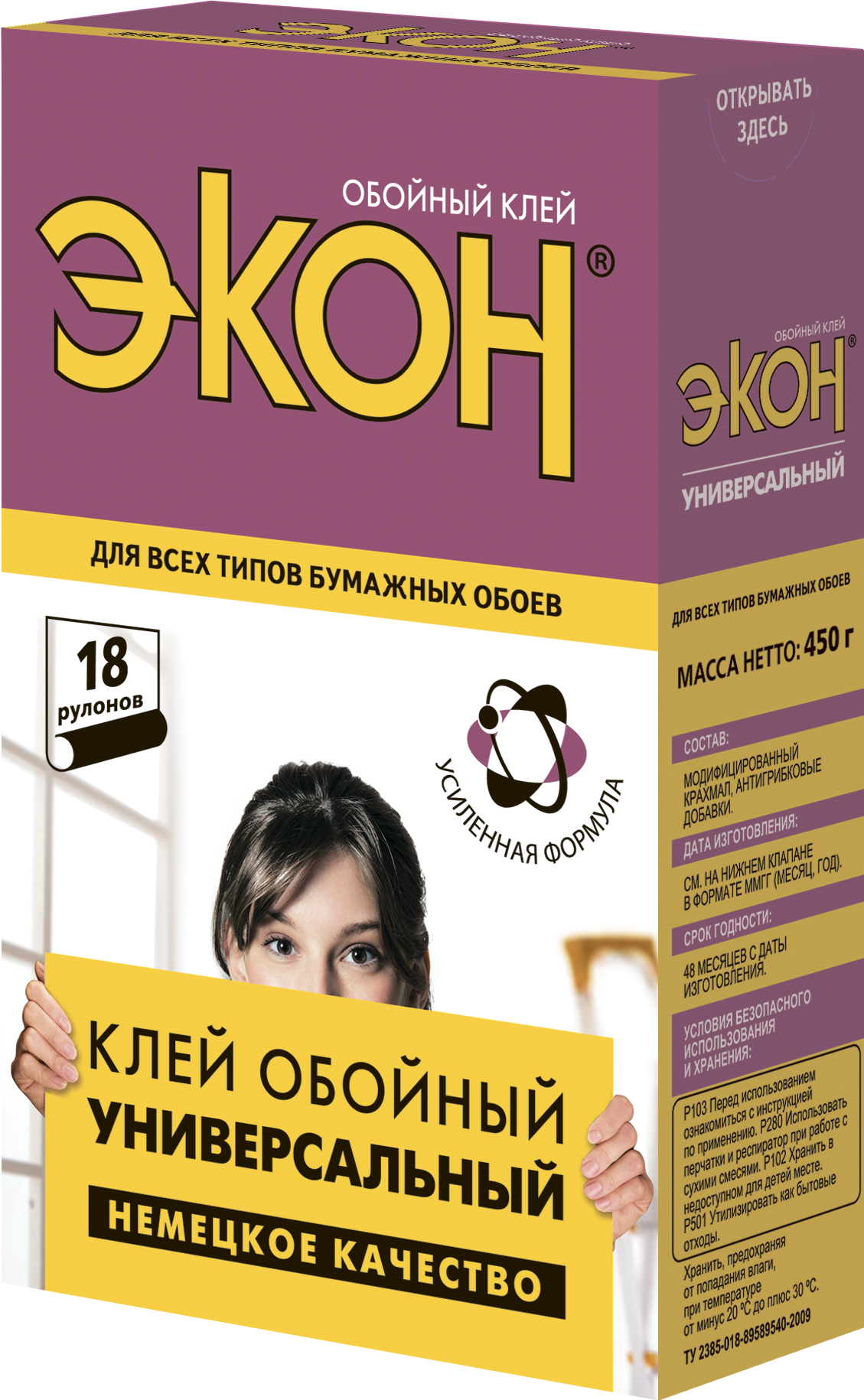 Клей для обоев "ЭКОН Универсальный" применяется для всех видов обоев на бумажной основе: гладких, структурных, гофрированных и дюплекс. Обеспечивает надежное приклеивание. Содержит антигрибковые добавки. Готовность клея - 15 минут. Им удобно пользоваться, и он не оставляет следов на обоях.