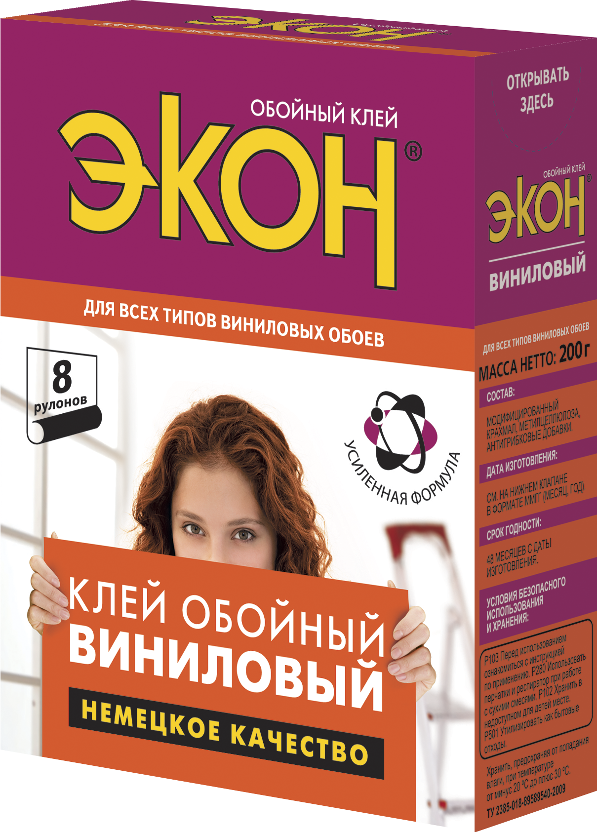 Клей для обоев "ЭКОН Виниловый" используется для всех видов виниловых обоев, вспененного винила и обоев с шелкографией. Им удобно пользоваться. Усиленная формула обеспечивает равное нанесение без подтеков и надежное приклеивание. Готовность в течение 15 минут.