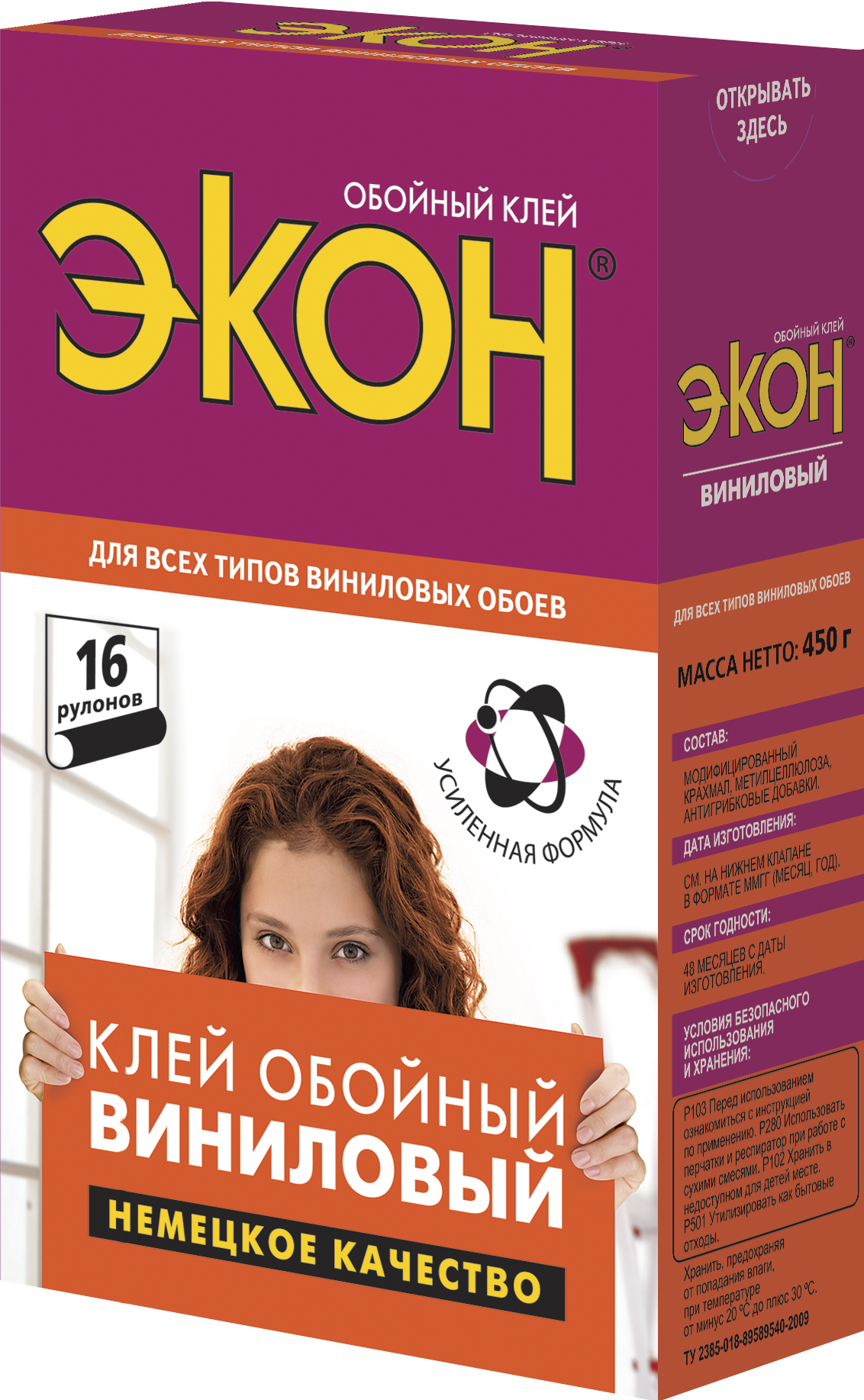 Клей для обоев "ЭКОН Виниловый" используется для всех видов виниловых обоев, вспененного винила и обоев с шелкографией. Им удобно пользоваться. Усиленная формула обеспечивает равное нанесение без подтеков и надежное приклеивание. Готовность в течение 15 минут.