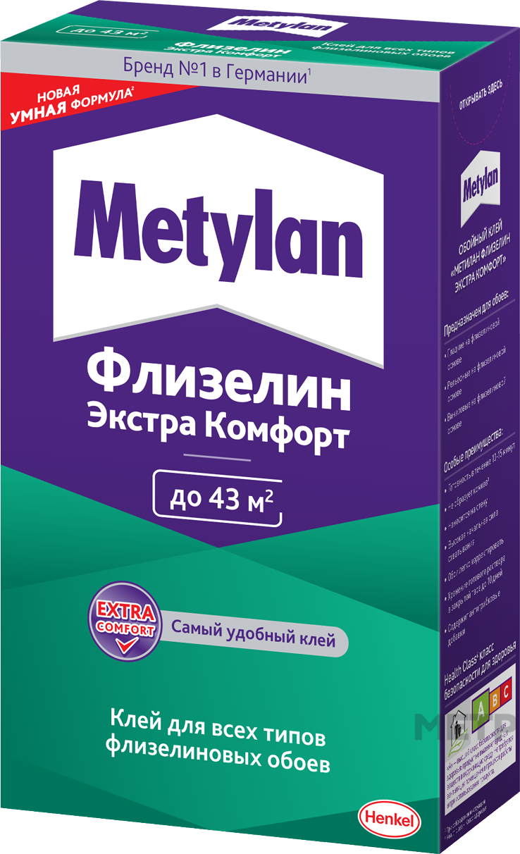 Клей для обоев "Метилан Флизелин Экстра Комфорт" применяется для гладких, рельефных и виниловых обоях на флизелиновой основе. Также используется для стеклообоев. Обладает высокой силой схватывания. В течении 15 минут можно легко скорректировать наклеивание обоев до 5 раз. Клей просто разводится и не образует комков. Готовность в течение 10-15 минут.