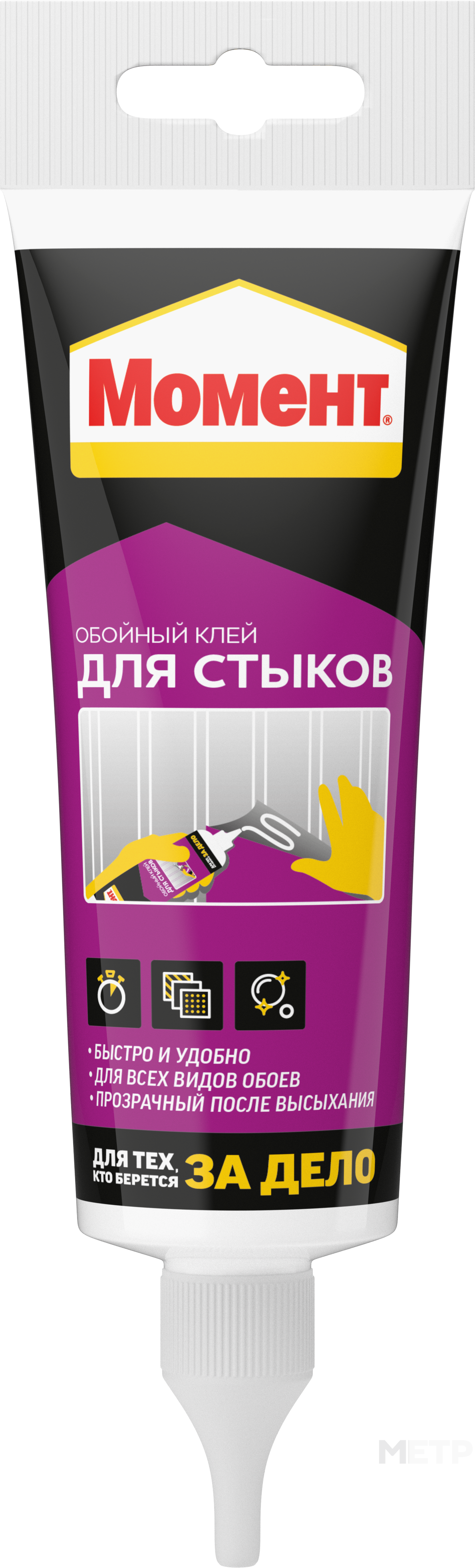 Клей для стыков обоев "Момент" применяется для подклеивания стыков обоев всех видов. Сразу готов к применению. Изготовлен на основе ПВА. У него высокая сила приклеивания и он не растекается. Клей устойчив к перепадам температур. Становится прозрачным после высыхания. Есть удобный носик для точного дозирования.