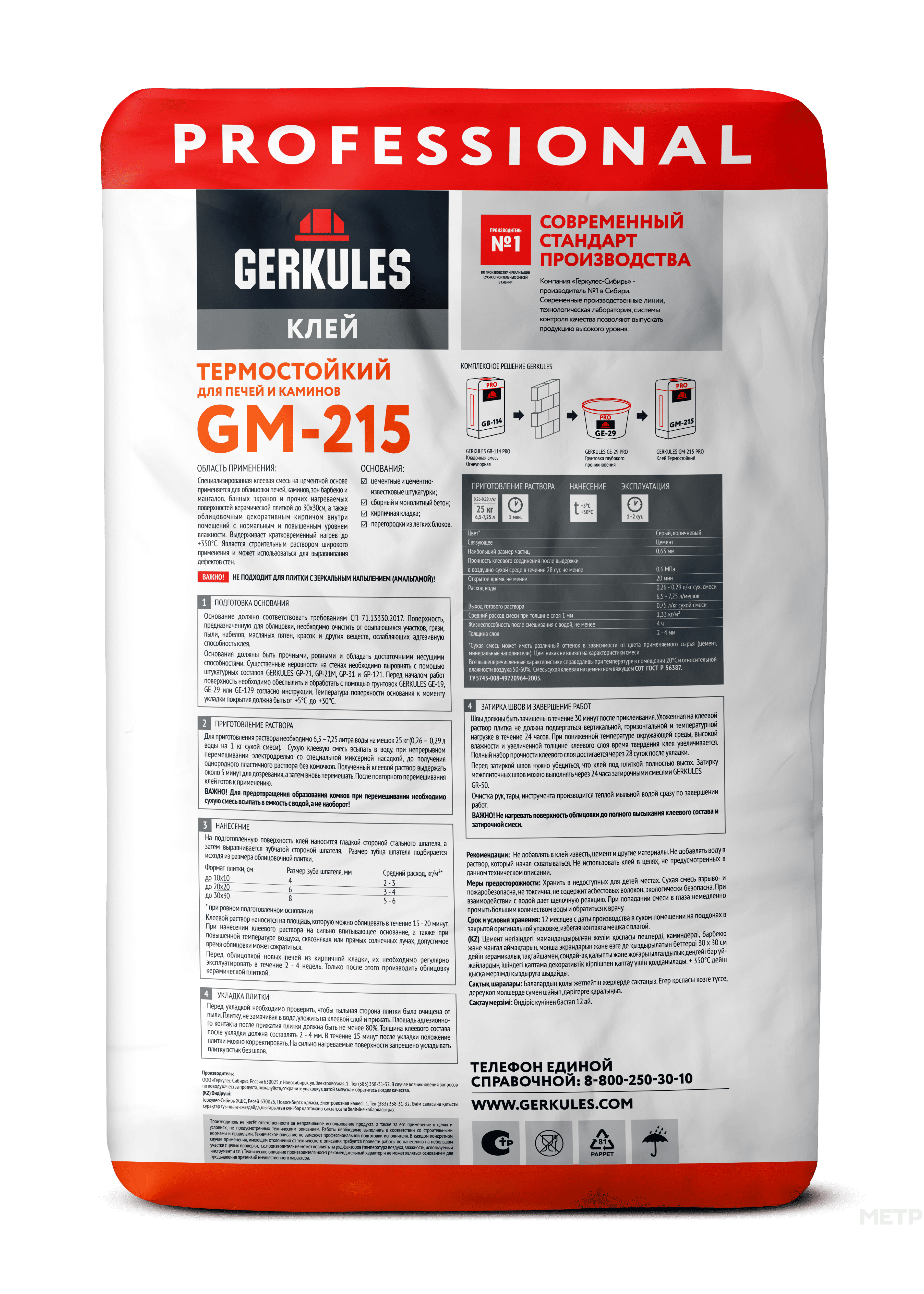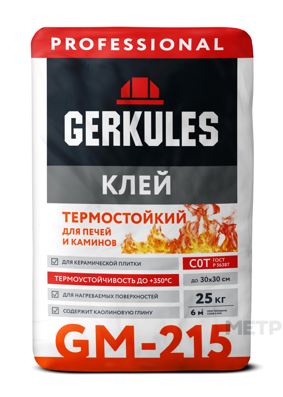 Клей для печей и каминов GM-215 Геркулес 25 кг предназначен для облицовки керамической плиткой печей и каминов, подверженных динамическому температурному воздействию. Для облицовки применяется низкопористая керамическая плитка или глазурованный кафель с высокой прочностью на изгиб, размером не более 300х300 мм. Рекомендуется использовать для кладки каминов и печей. Выдерживает кратковременный нагрев до +350 0С. Клей термостойкий и эластичный, облицовка не подвержена отслоениям при циклических термомеханических нагрузках, которые создаются на поверхности печей и каминов при эксплуатации.
