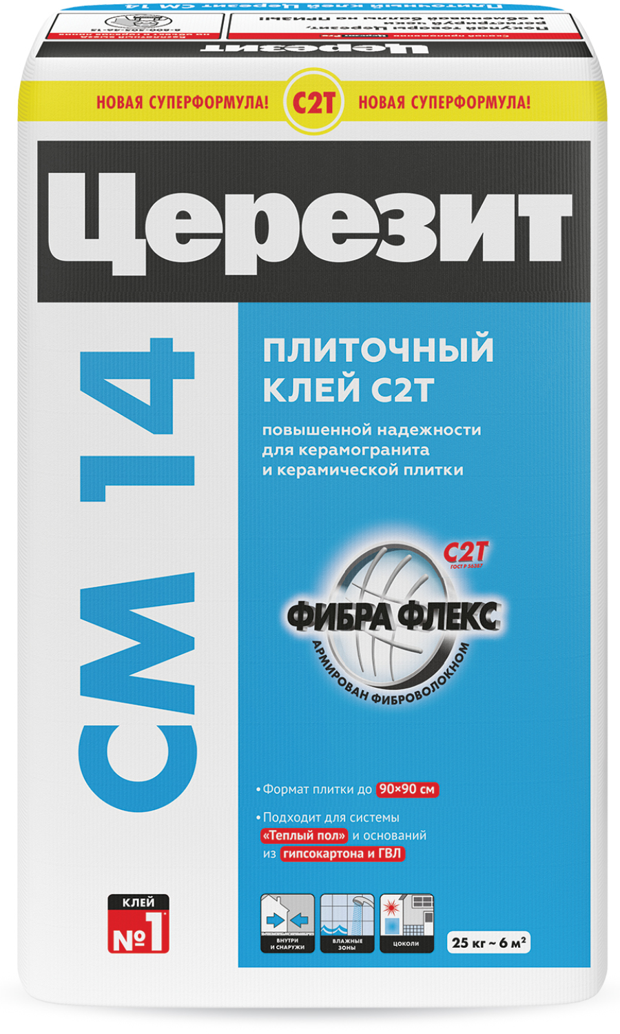 Клей для плитки и керамогранита CM 14 Extra Церезит 25 кг предназначен для крепления всех видов керамических плиток, керамогранита, плиток из искусственного (на цементной основе) и природного (кроме мрамора) камня размером до 90×90 см — на стенах и полах, внутри (включая влажные помещения и стяжки с подогревом) и снаружи зданий. Применяется на недеформирующихся бетонных и цементных основаниях, в том числе с изготовленными на них гидроизоляционными покрытиями из материалов CR 65, CR 166 и CL 51.