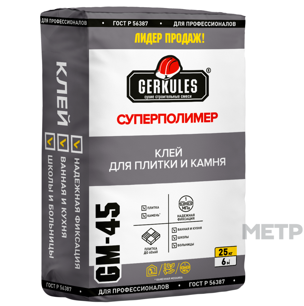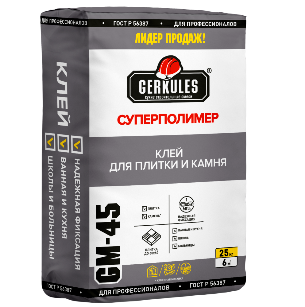 Клей для плитки и керамогранита Суперполимер GM-45 Геркулес 25 кг, применяется для облицовки стен и полов керамической плиткой по бетону, кирпичу, штукатурке внутри здания. Допускается использовать плитку размером не более 600х600 мм. Облицовку пола проводить только в жилых, административных и бытовых помещениях. Является строительным раствором широкого применения и может использоваться для выравнивания дефектов стен, потолков и полов. Не подходит для плитки с зеркальным напылением.