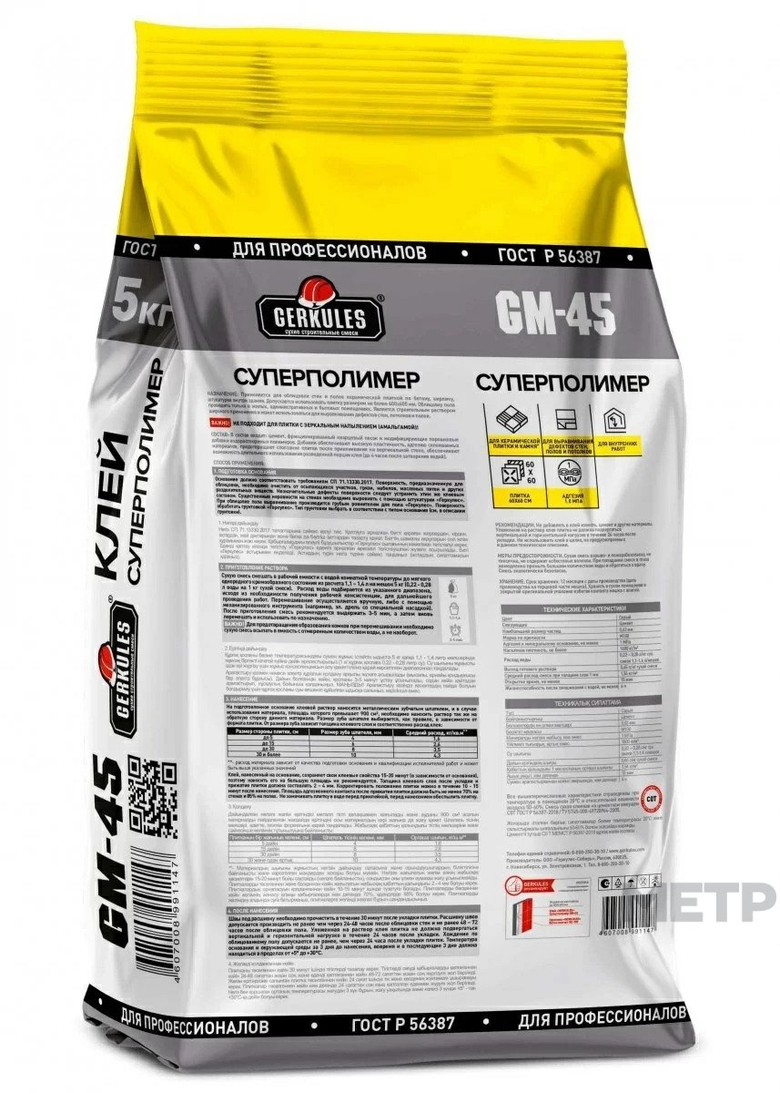 Клей для плитки и керамогранита Суперполимер GM-45 Геркулес 5 кг, - применяется для облицовки стен и полов керамической плиткой по бетону, кирпичу, штукатурке внутри здания. Допускается использовать плитку размером не более 600х600 мм. Облицовку пола можно проводить только в жилых, административных и бытовых помещениях. Является строительным раствором широкого применения и может использоваться для выравнивания дефектов стен, потолков и полов. Не подходит для плитки с зеркальным напылением.