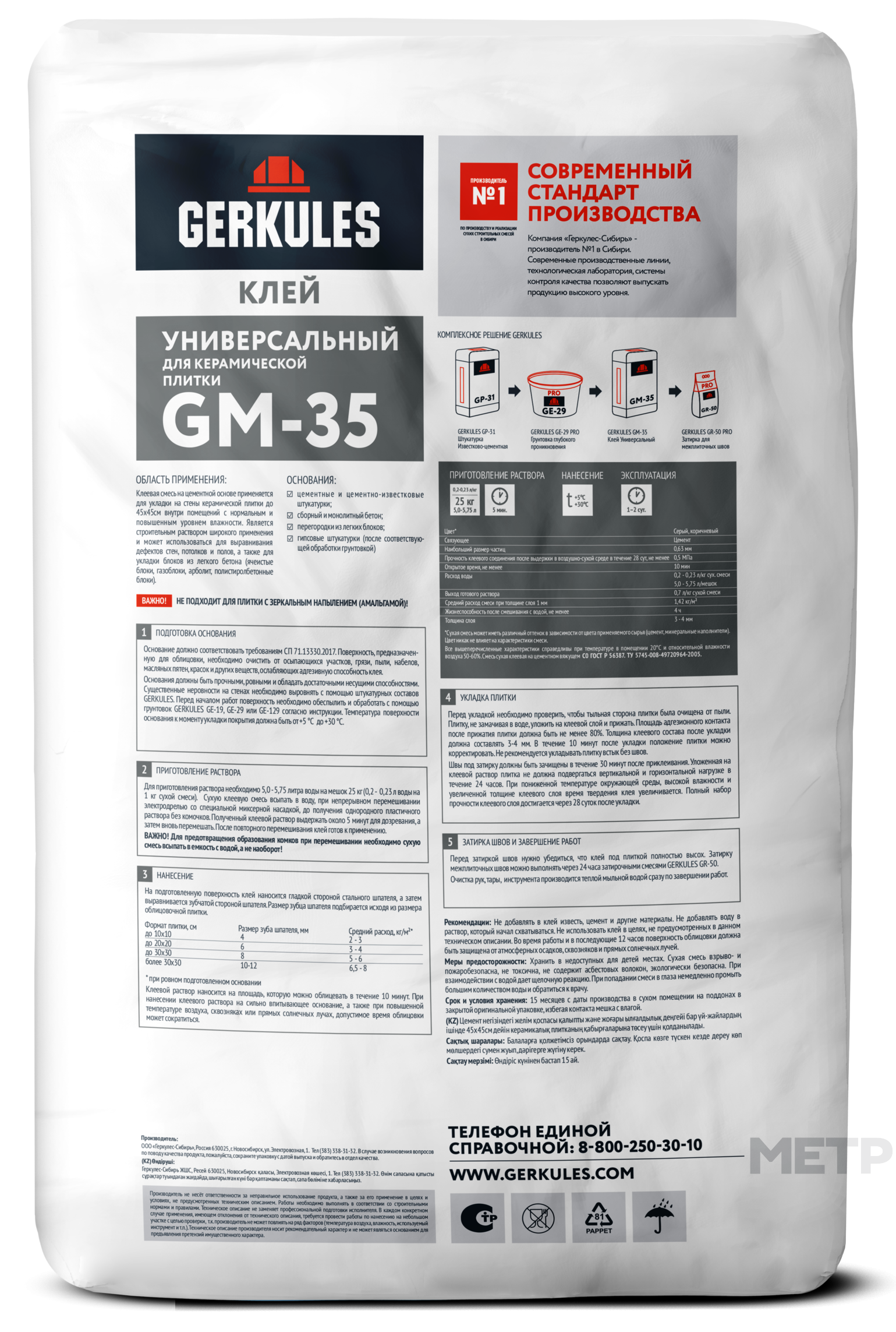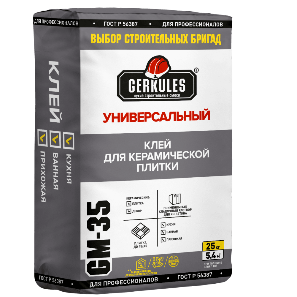 Клей для плитки Универсальный GM-35 Геркулес 25 кг, применяется для облицовки керамической плиткой стен из бетона, кирпича, оштукатуренных поверхностей внутри помещений с нормальной и повышенной влажностью. Допускается использовать плитку размером не более 450х450 мм. Является строительным раствором широкого применения и может использоваться для выравнивания дефектов стен, потолков и полов (не более 10 мм). Не подходит для плитки с зеркальным напылением.