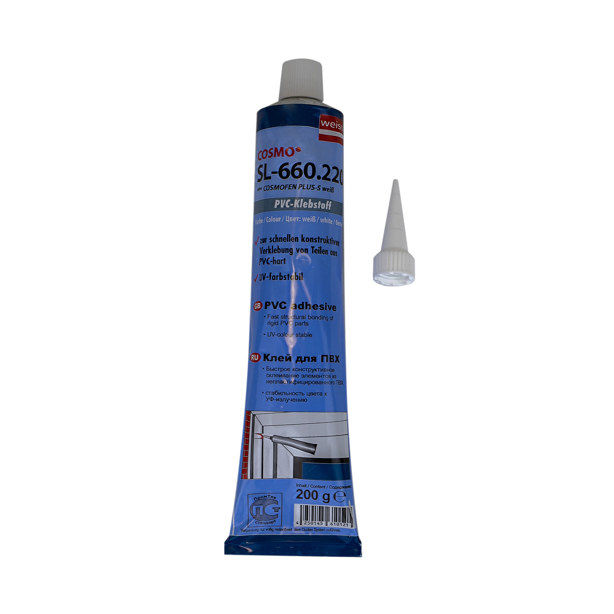 Клей COSMOFEN PLUS-S Жидкий пластик алюминиевый мембранный тюбик белый 200 гр, - однокомпонентный диффузионный клей для быстрого конструкционного склеивания деталей из жёсткого ПВХ (оконное производство, сантехнические работы). Образует качественный шов высокой прочности с эффектом «жидкий пластик» белого цвета. Стойкий к УФ-излучению и внешним атмосферным воздействиям. Быстро высыхает. Не растекается. Устойчив к перепадам температур.