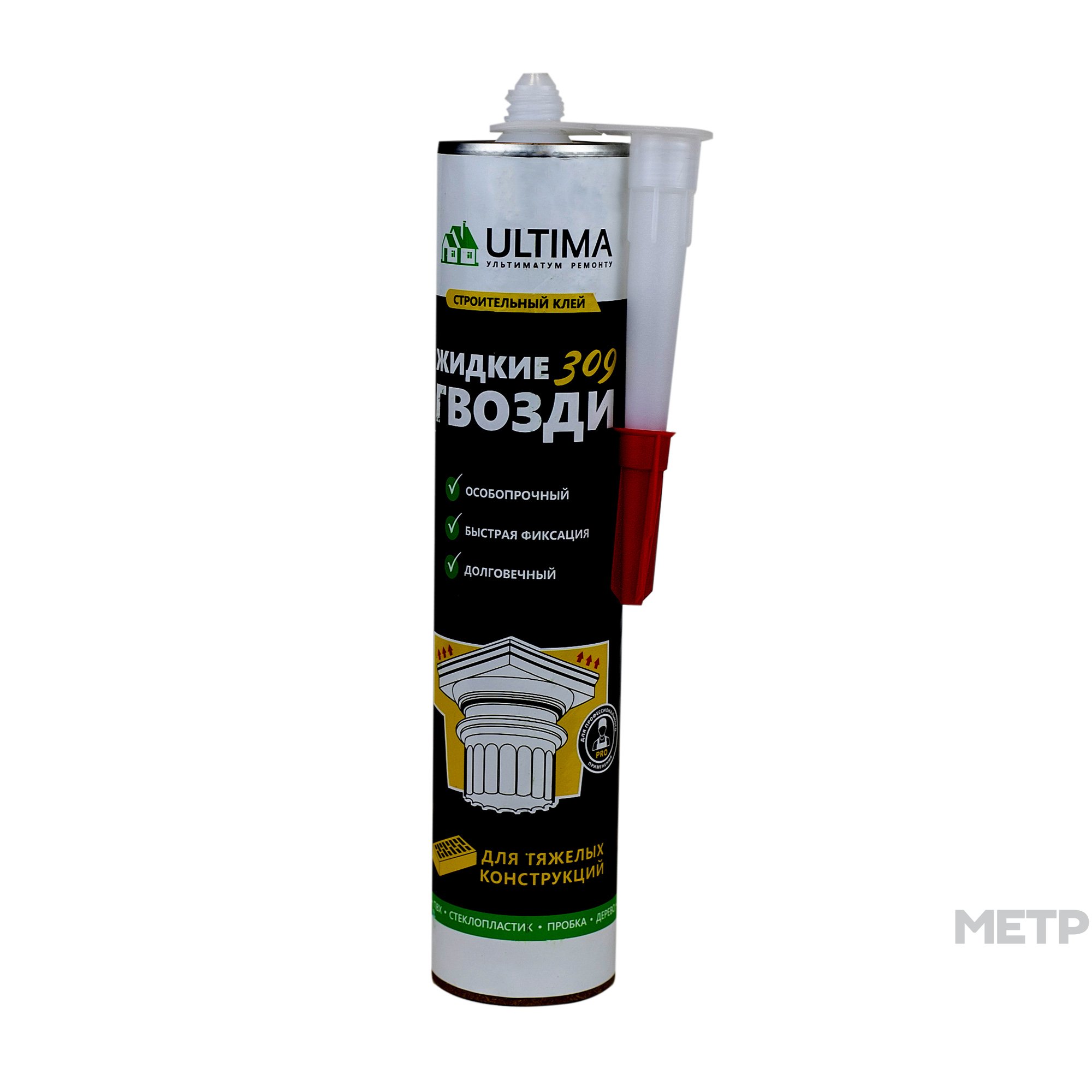 Клей Ultima 309 для тяжелых конструкций 310 мл, - однокомпонентный клей-герметик усиленного действия для тяжелых конструкций. Формула, обеспечивающая моментальное схватывание, прочно удерживает склеиваемые поверхности, что позволяет снизить требования к их фиксации при склейке. Подходит для склеивания большинства строительных материалов в ходе выполнения внутренних и наружных общестроительных работ, и ремонта (для склеивания керамики, дерева, металла, оргалита, камня, кирпича, бетона, фанеры, деревянных панелей, стеновых ПВХ и МДФ панелей и др.). Клей обладает прекрасной адгезией и не стекает при нанесении на вертикальные поверхности. Может использоваться в условиях повышенной влажности. Подходит для заполнения швов при склеивании неровных поверхностей.