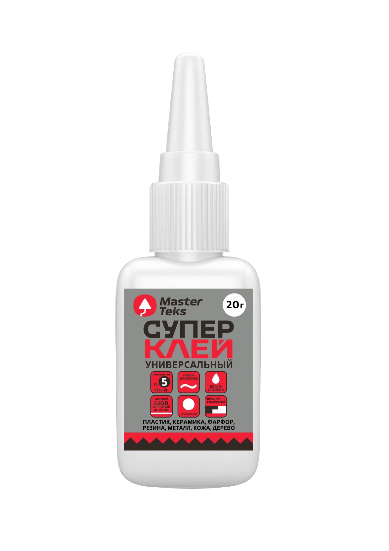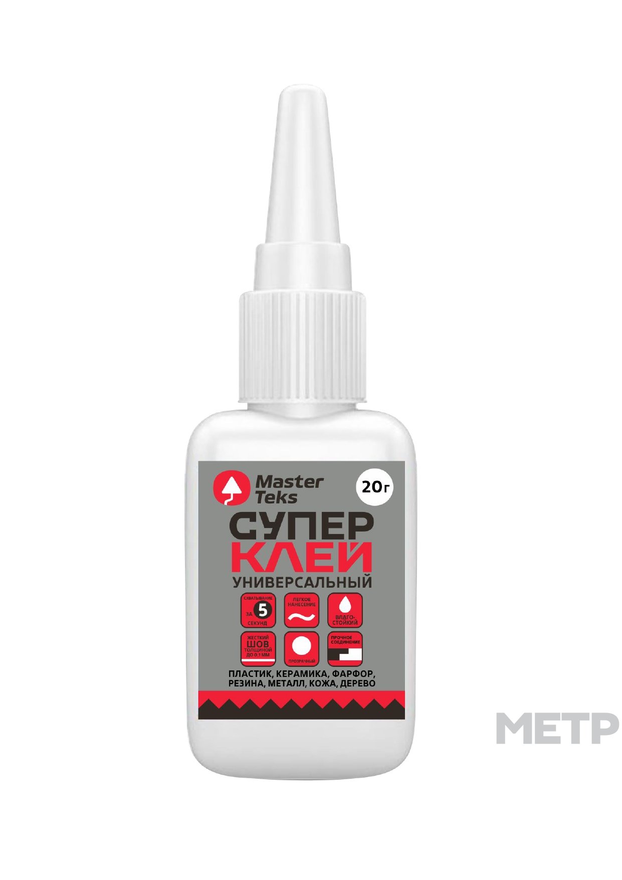 Клей Супер MasterTeks, цианоакрилатный универсальный , в шоубоксе, прозрачный, 20 гр, предназначен для моментального и качественного склеивания изделий из разных видов материалов (пластика, керамики, фарфора, резины, металла, кожи, дерева и др.) Не рекомендуется применять для склеивания изделий из полиэтилена, полипропилена, тефлона.