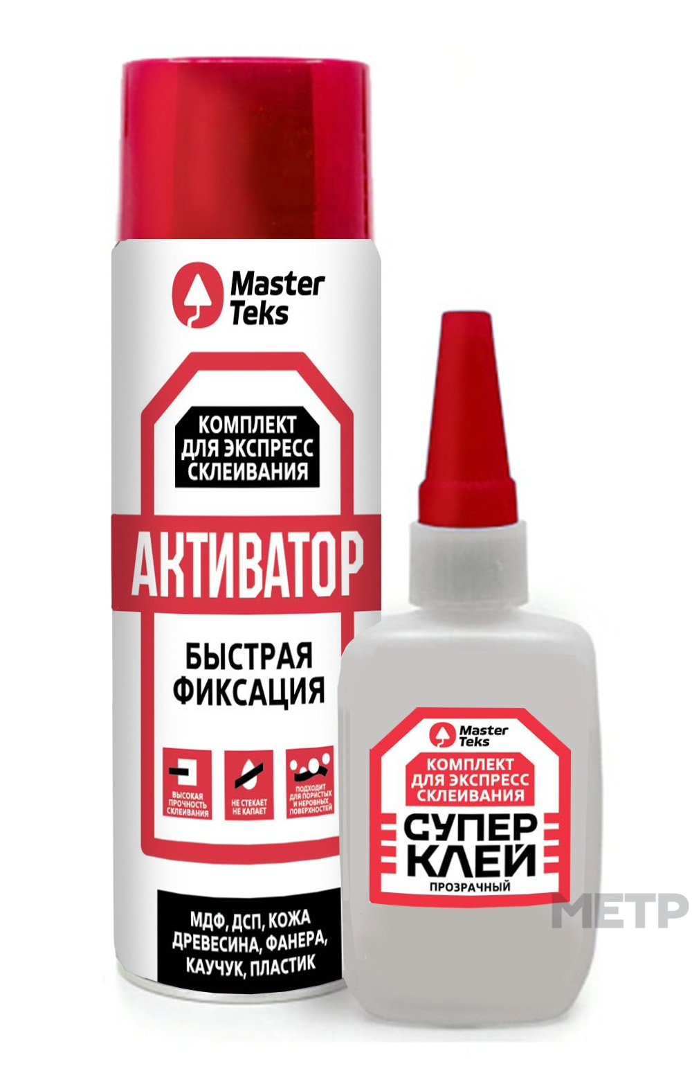 Клей Супер MasterTeks, прозрачный - двухкомпонентный цианакрилатный клей высокой вязкости, 50 гр, аэрозоль-активатор 200 мл. Предназначен для крепления и соединения строительных материалов, заменяет цемент и цементно-клеевые смеси. Благодаря гелеобразному составу подходит для использования на вертикальных поверхностях. Применяется при изготовлении и ремонте мебели, используется для склеивания любых древесных материалов (МДФ, ДСП, древесина, фанера), а также каучука, большинства пластмасс, кожи и т.д.