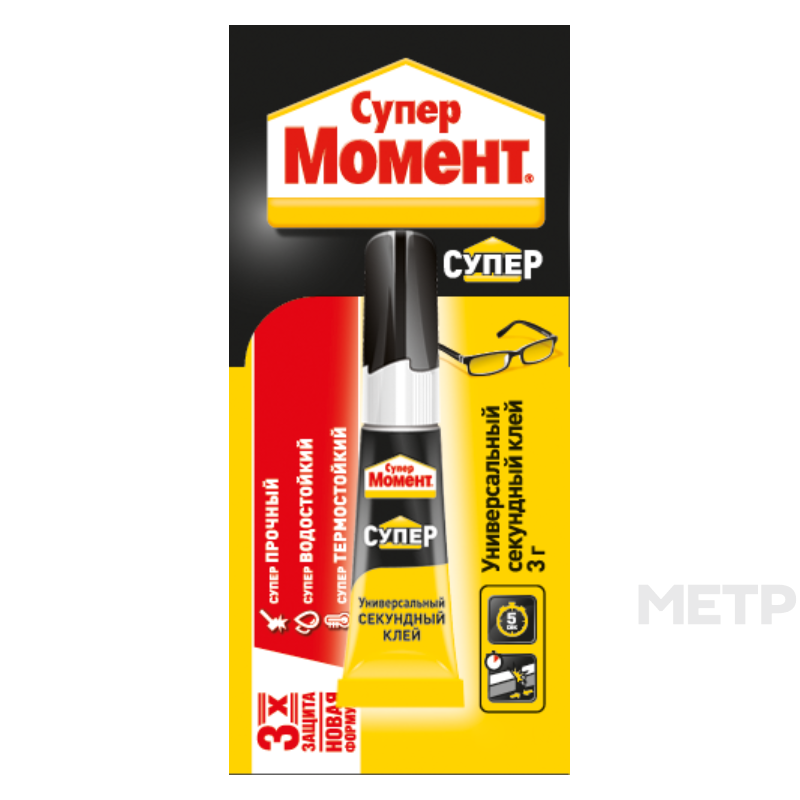 Клей Супер Момент универсальный на блистер карте прозрачный 3 г, - универсальный секундный клей предназначен для моментального склеивания большинства типов материалов, таких как пластмасса, резина, металл, дерево, фарфор, керамика, кожа, пробка, ткань, картон и прочие подобные материалы. Новая Формула обеспечивает мгновенное склеивание (5-60 сек), Прозрачный, Сверхпрочный клеевой шов. Клей хорошо растекается, заполняет мельчайшие трещины.