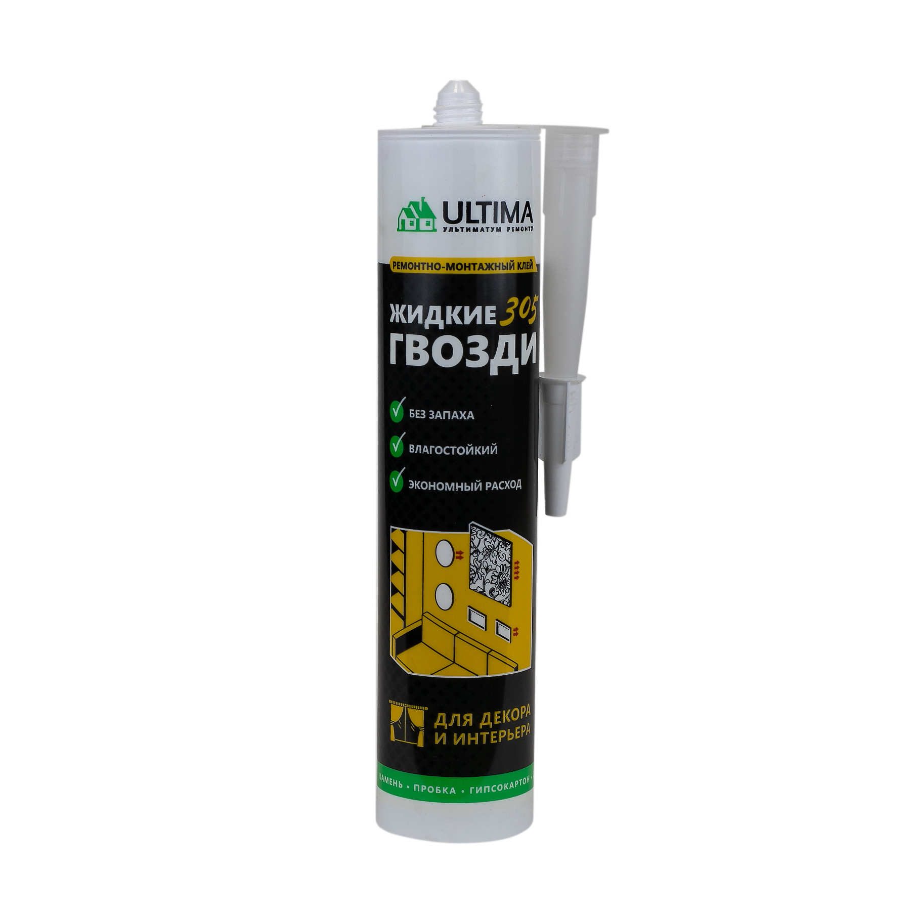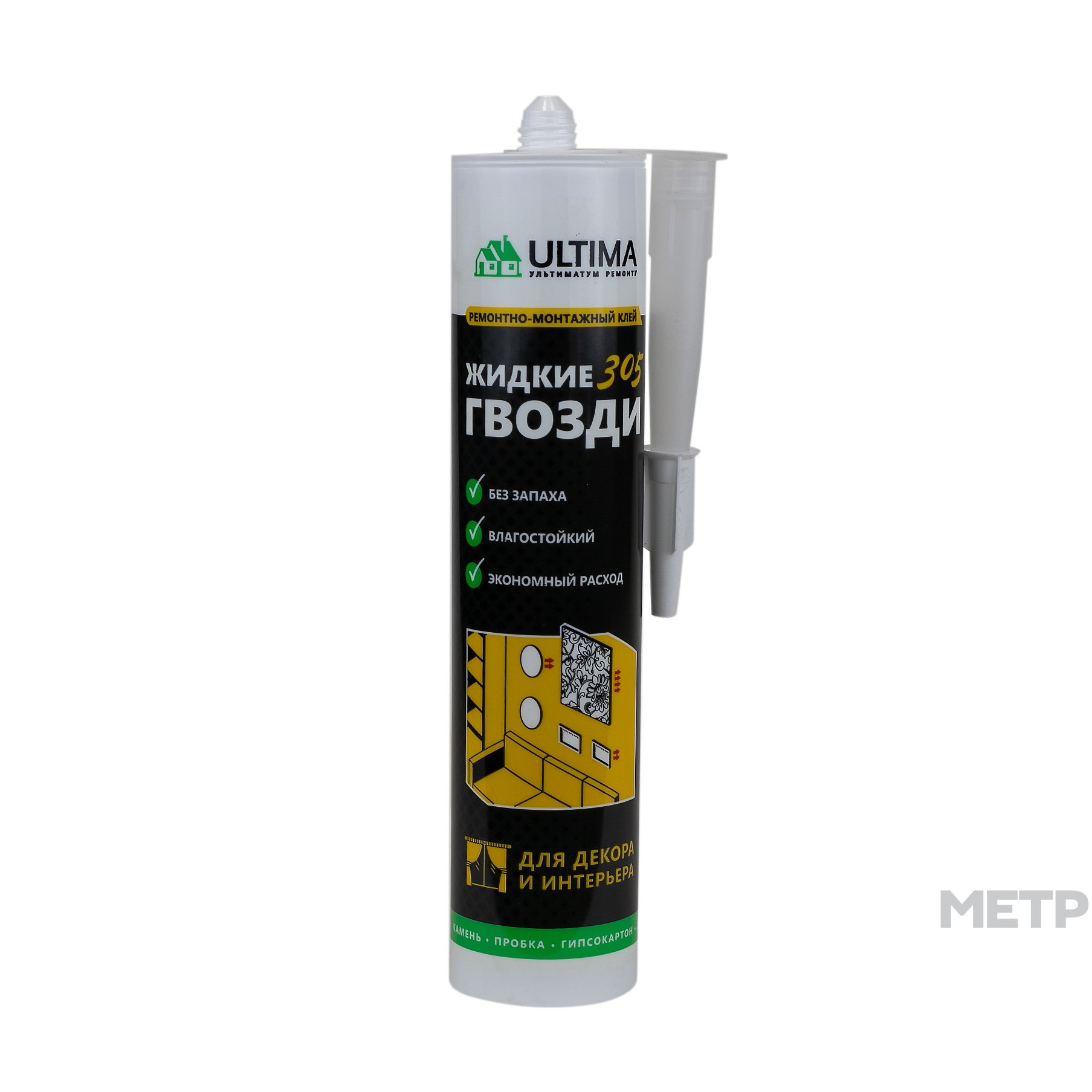 Клей Ultima 305 универсальный 310 мл, - универсальный строительный высококачественный клей на основе полиакриловой дисперсии для широкого ряда строительных материалов. Обеспечивает прочное долговечное соединение. Подходит для склеивания молдингов, панелей, обрешетки, фанеры, неполированного камня, пробковых панелей, вспененных панелей, гипсокартона, ДСП, керамики, дерева, бетона, штукатурки, плитки, кирпича, полистирола. Обладает отличной адгезией к большинству строительных материалов. Позволяет корректировать положение склеиваемых поверхностей в течение 10 минут до начала схватывания. Можно окрашивать дисперсионными красками.