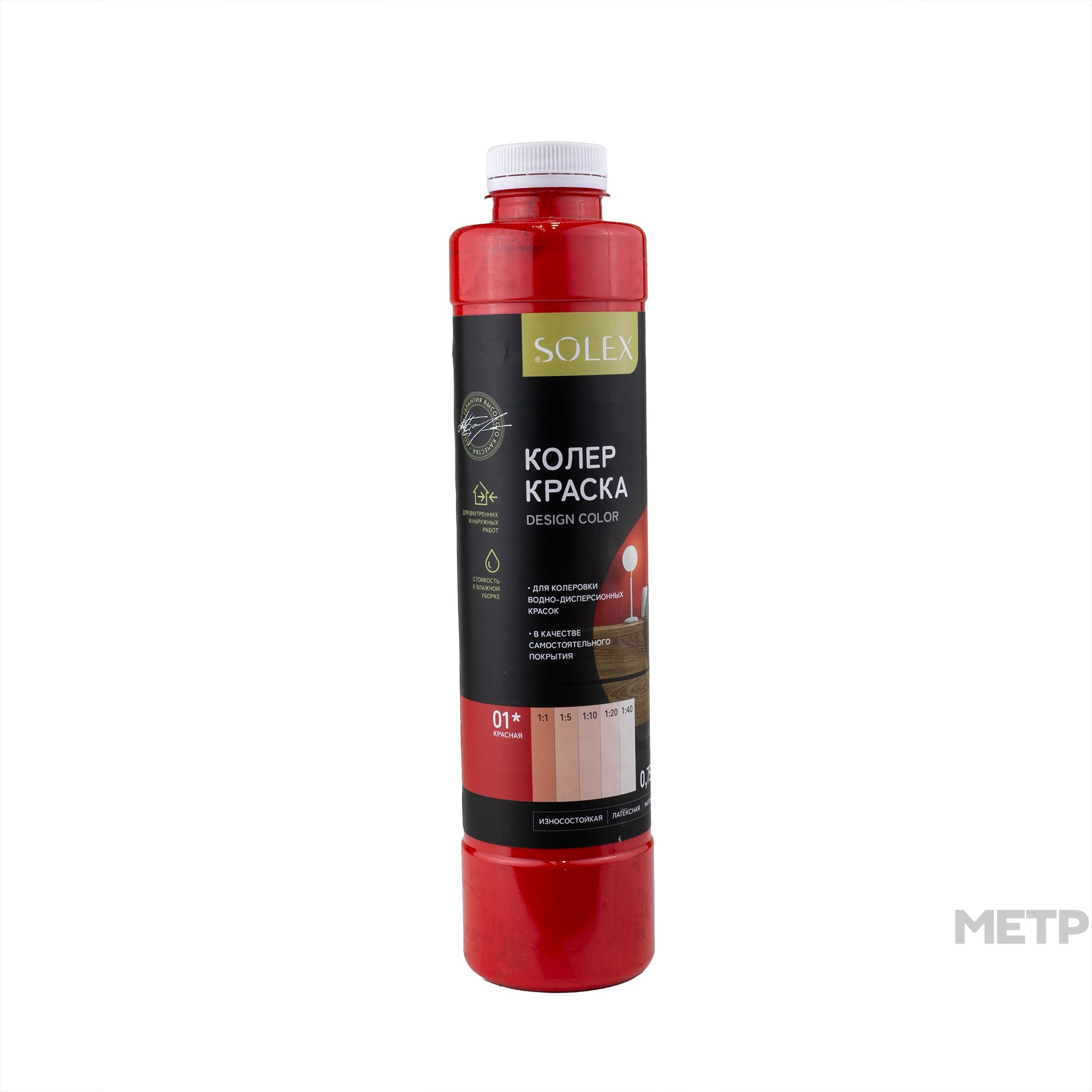 Колер-краска SOLEX красный № 01, 0,75 л применяется как самостоятельное покрытие:в интерьере и на фасадах, в том числе для создания акцентных стен в ванных комнатах и помещениях с повышенной эксплуатационной нагрузкой; в художественном творчестве (для интерьерных картин и скульптур); для декора мебели. Также используется для колерования ВД красок, шпаклевок и штукатурок на водной основе. Наносить колер-краску или заколерованый материал при температуре не ниже +5˚С.