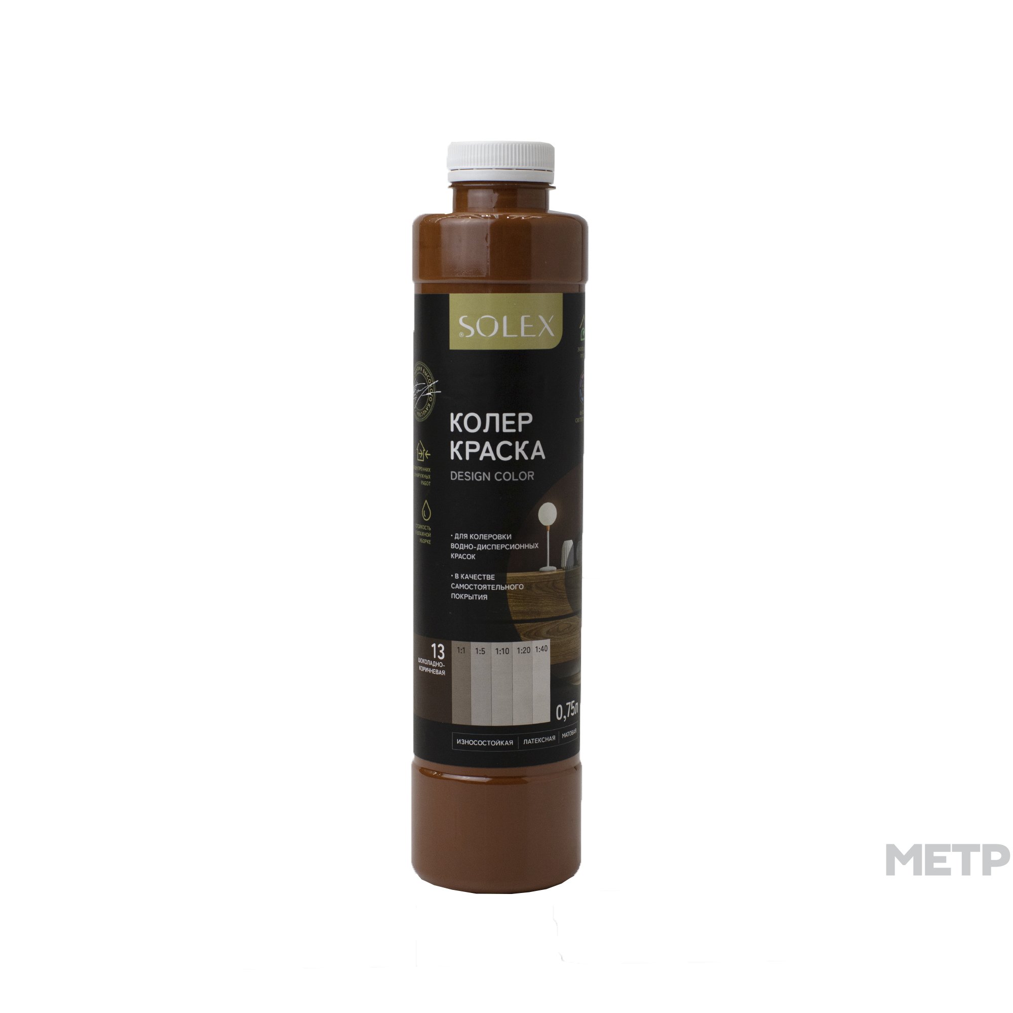 Колер-краска SOLEX шоколадно-коричневый №13, 0,75 л применяется как самостоятельное покрытие:в интерьере и на фасадах, в том числе для создания акцентных стен в ванных комнатах и помещениях с повышенной эксплуатационной нагрузкой; в художественном творчестве (для интерьерных картин и скульптур); для декора мебели. Также используется для колерования ВД красок, шпаклевок и штукатурок на водной основе. Наносить колер-краску или заколерованый материал при температуре не ниже +5˚С.