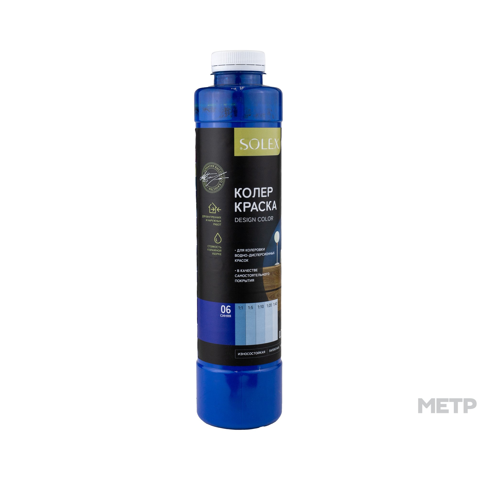 Колер-краска SOLEX синий № 06, 0,75 л применяется как самостоятельное покрытие:в интерьере и на фасадах, в том числе для создания акцентных стен в ванных комнатах и помещениях с повышенной эксплуатационной нагрузкой; в художественном творчестве (для интерьерных картин и скульптур); для декора мебели. Также используется для колерования ВД красок, шпаклевок и штукатурок на водной основе. Наносить колер-краску или заколерованый материал при температуре не ниже +5˚С.