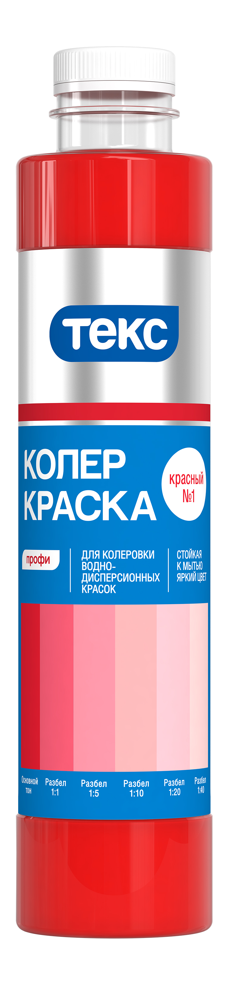 КОЛЕР КРАСКА «ТЕКС» (для водно-дисперсионных красок) красная 0,75 л является водно-дисперсионной матовой краской насыщенного цвета. Применяется как самостоятельно (в сухих и влажных помещениях), так и для тонирования водноразбавляемых материалов для фасадов и внутренних работ (красок, шпатлевок, штукатурок).