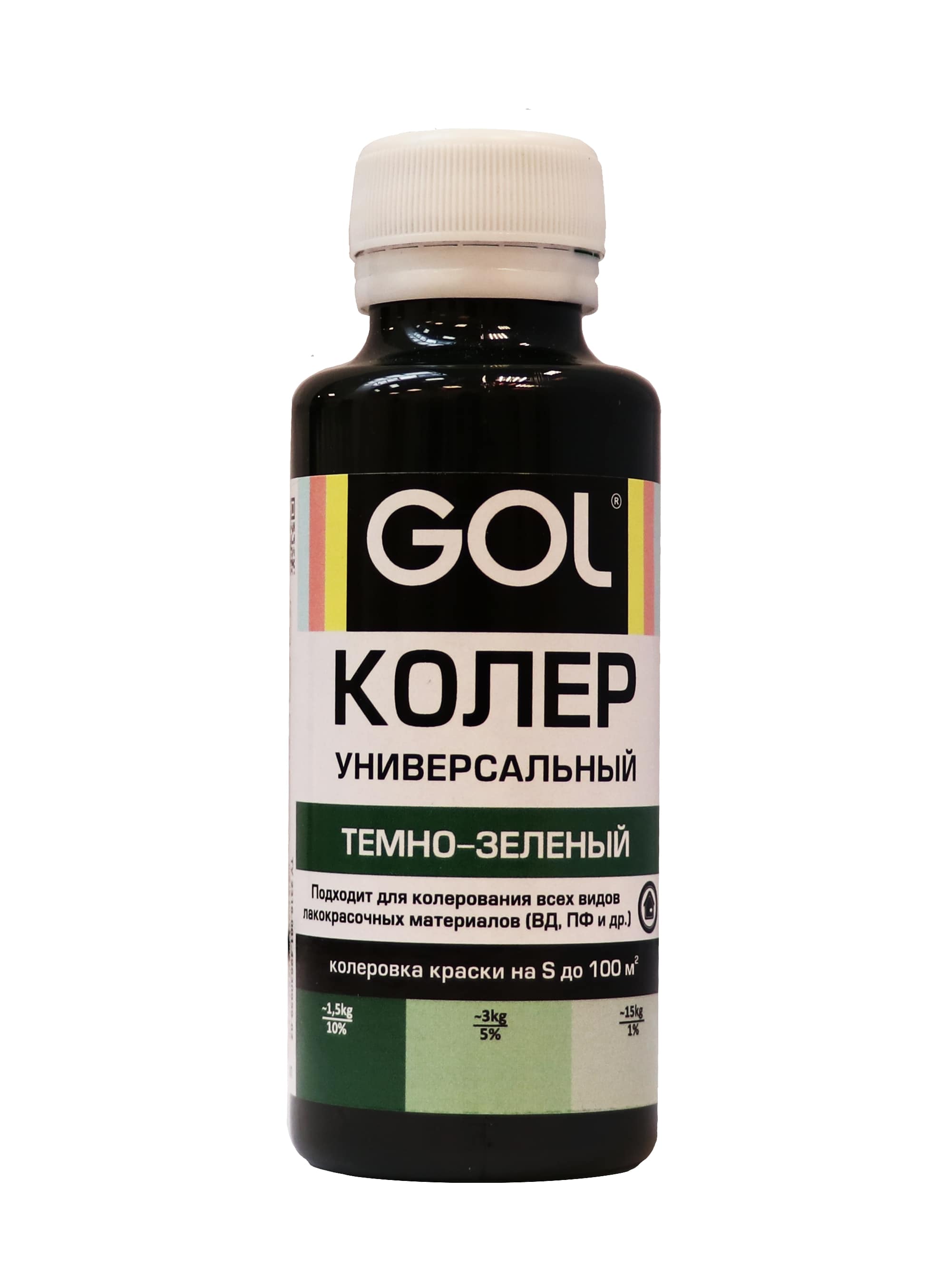Паста колеровочная универсальная GOLтемно-зеленая 0,1 л применяется для колерования эмалей, лаков, красок, затирок, штукатурок и лазурей для дерева на масляной, водной, и др. органических основах. Перед применением флакон с пастой необходимо встряхнуть, после чего необходимое количество пасты ввести в небольшую часть краски и тщательно перемешать. Полученную, в результате этого, смесь добавить, перемешивая, в остальную часть краски, перемешать. Рекомендуется вводить в краску не более 5%