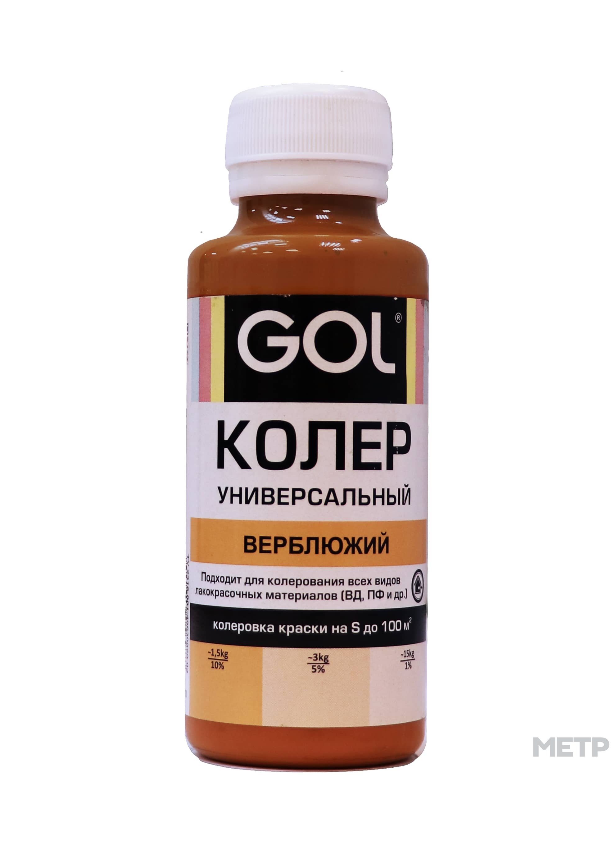 Паста колеровочная универсальная GOL верблюжий 0,1 л применяется для колерования эмалей, лаков, красок, затирок, штукатурок и лазурей для дерева на масляной, водной, и др. органических основах. Перед применением флакон с пастой необходимо встряхнуть, после чего необходимое количество пасты ввести в небольшую часть краски и тщательно перемешать. Полученную, в результате этого, смесь добавить, перемешивая, в остальную часть краски, перемешать. Рекомендуется вводить в краску не более 5%