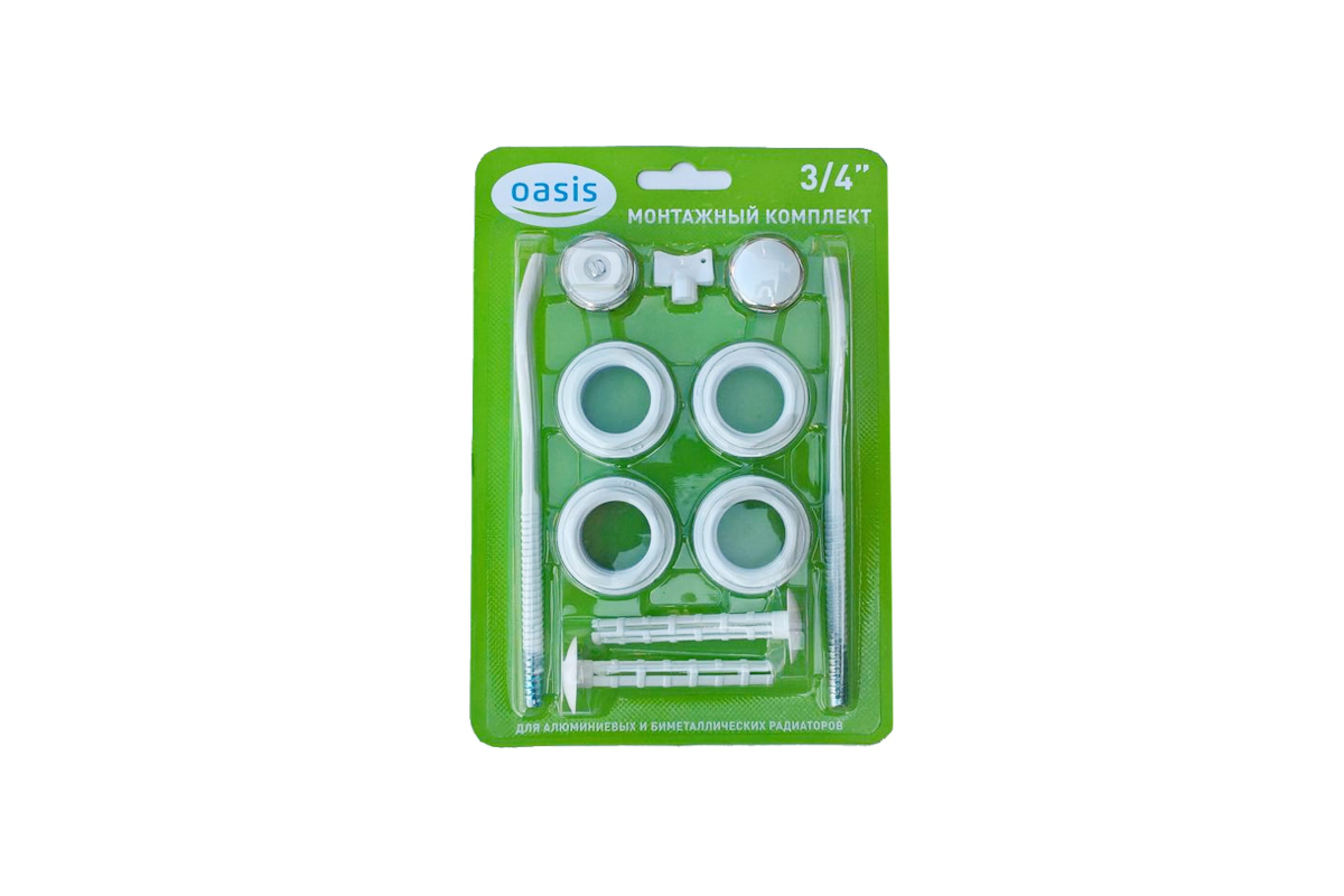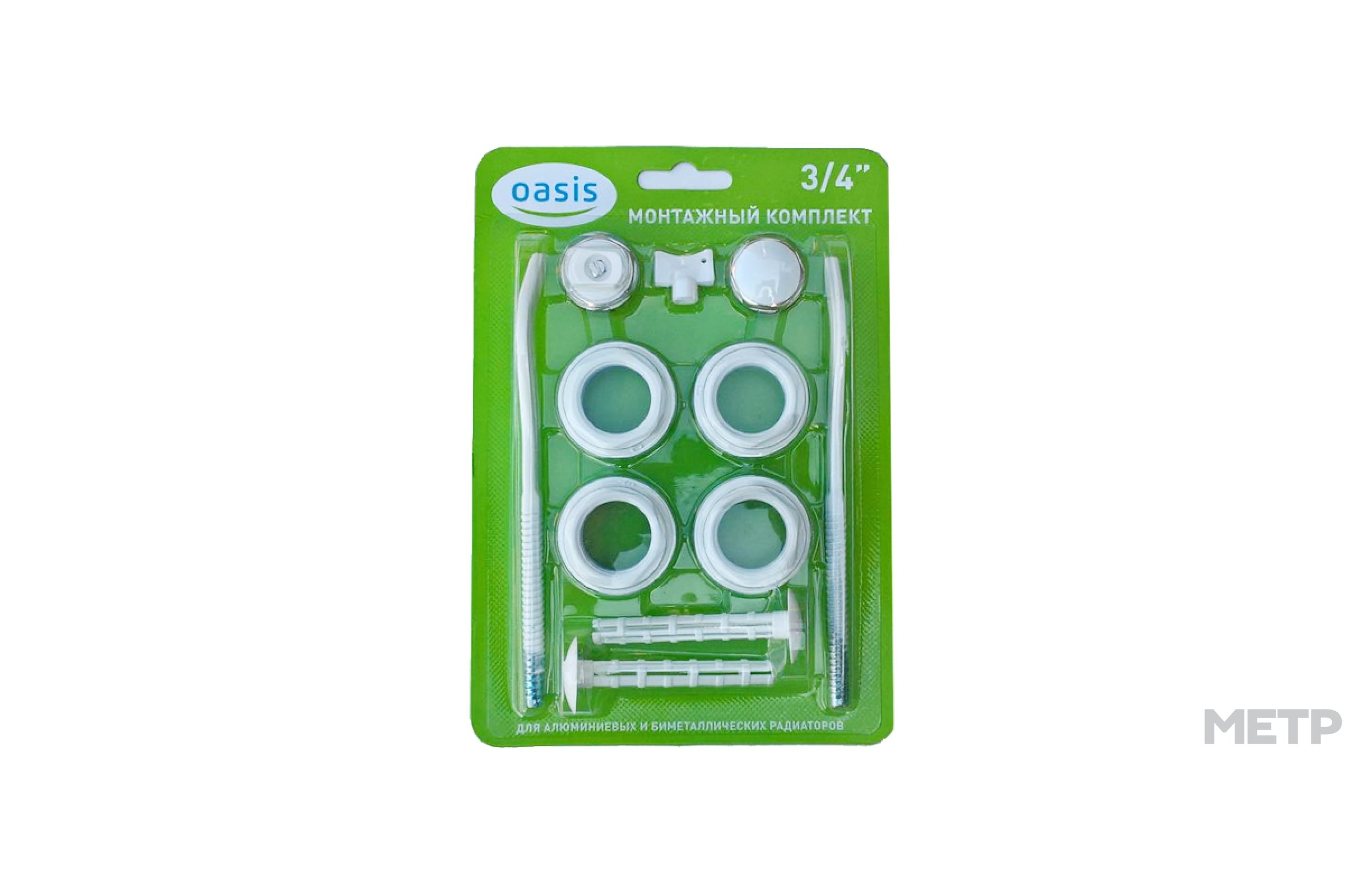 Комплект для монтажа радиатора Oasis 3/4" с двумя кронштейнами – фирменный набор для присоединения оборудования к системе водонагрева (диаметр труб 3/4 дюйма). Комплектация со специальными силиконовыми прокладками для исключения протечек. Элементы сделаны из качественной оцинкованной стали и никелированной латуни.