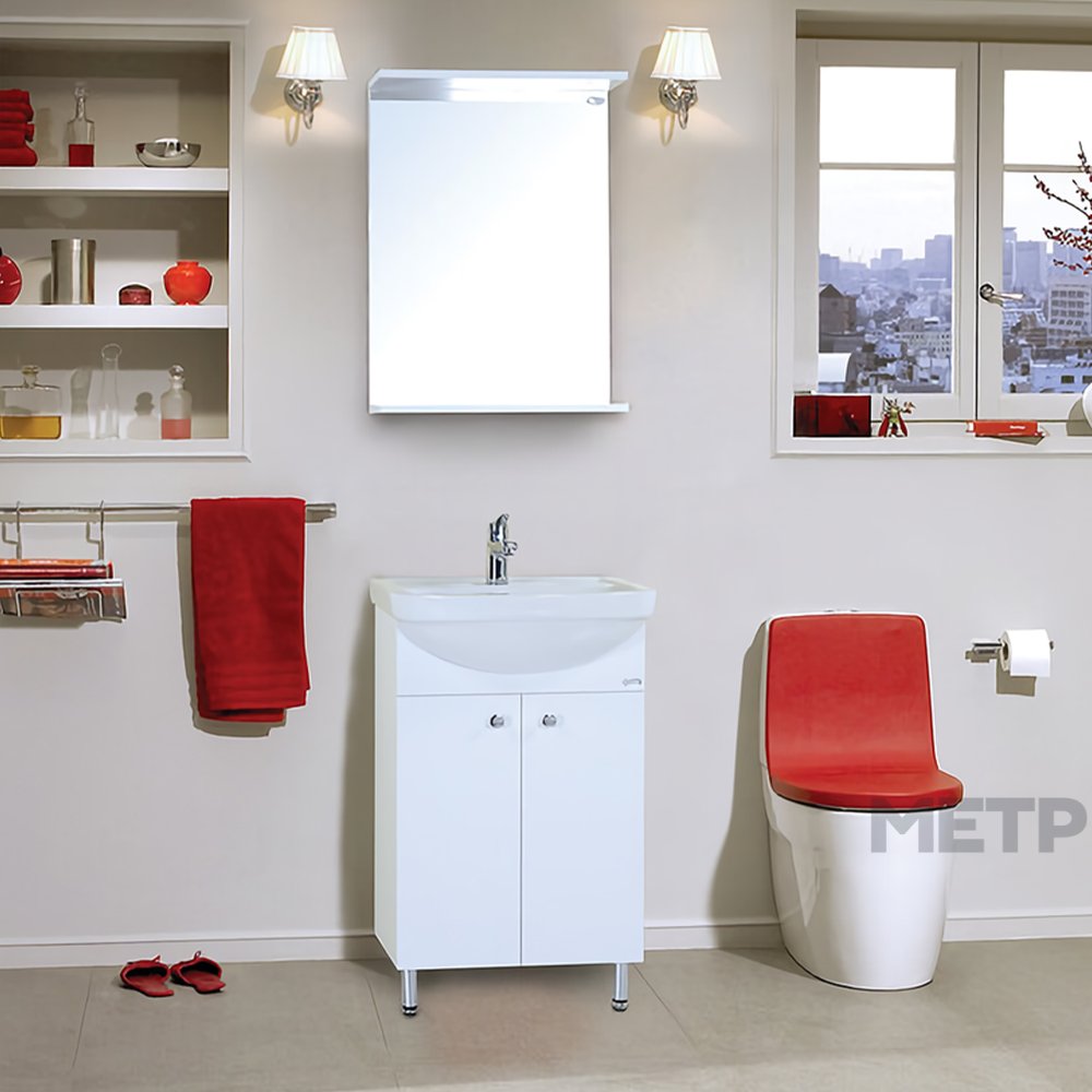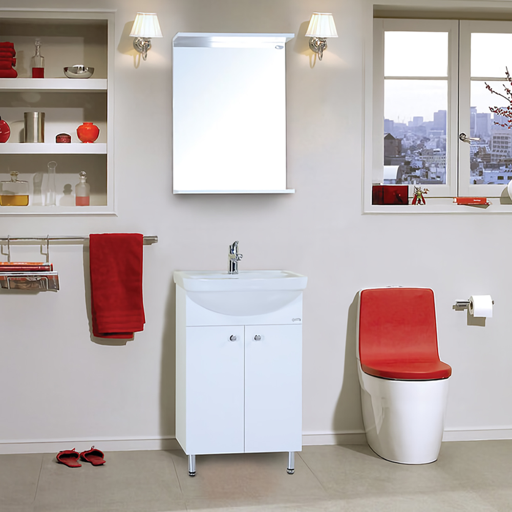 Комплект мебели для ванной комнаты напольный с зеркалом. Белого цвета, с распашными дверцами