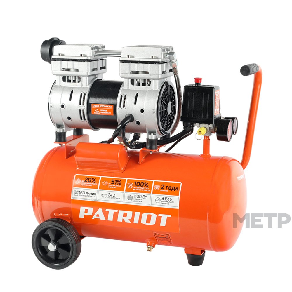 Компрессор PATRIOT WO24-160 двухцилиндровый, поршневой с прямым приводом (электрический двигатель). Эта компактная установка способна выдавать внушительную производительность (160 литров в минуту при мощности потребления 1100 Вт), надежна и проста в эксплуатации. Рациональный вариант!