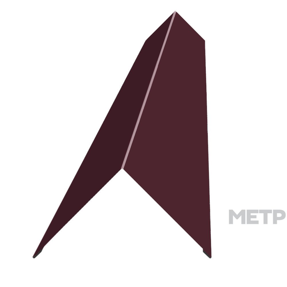 Конек плоский МеталлПрофиль 0,150х,0,150 х 2 метра красное вино 3005 - доборный элемент, предназначенный для защиты стыка пересечения двух наклонных скатов. Конек изготавливается из оцинкованного металла тощиной 0,45мм, края конька завальцованы.