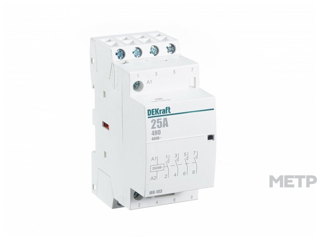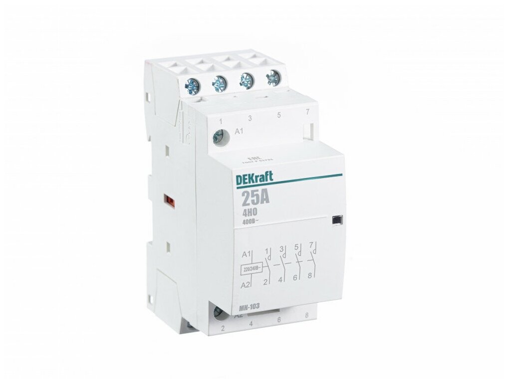 Контактор модульный Dekraft МК-103 25А 400В 4НО с напряжением катушки управления 230 В применяется в сетях переменного тока для дистанционного управления нагрузками небольшой мощности, требующими большого количества включений/отключений: автоматика инженерного оборудования зданий, насосного оборудования, систем вентиляции и кондиционирования, отопления, освещения и т.д. Не требует дополнительных настроек и специального обслуживания, необходима защита автоматическим выключателем. Крепится на DIN-рейку. Степень защиты IP20.