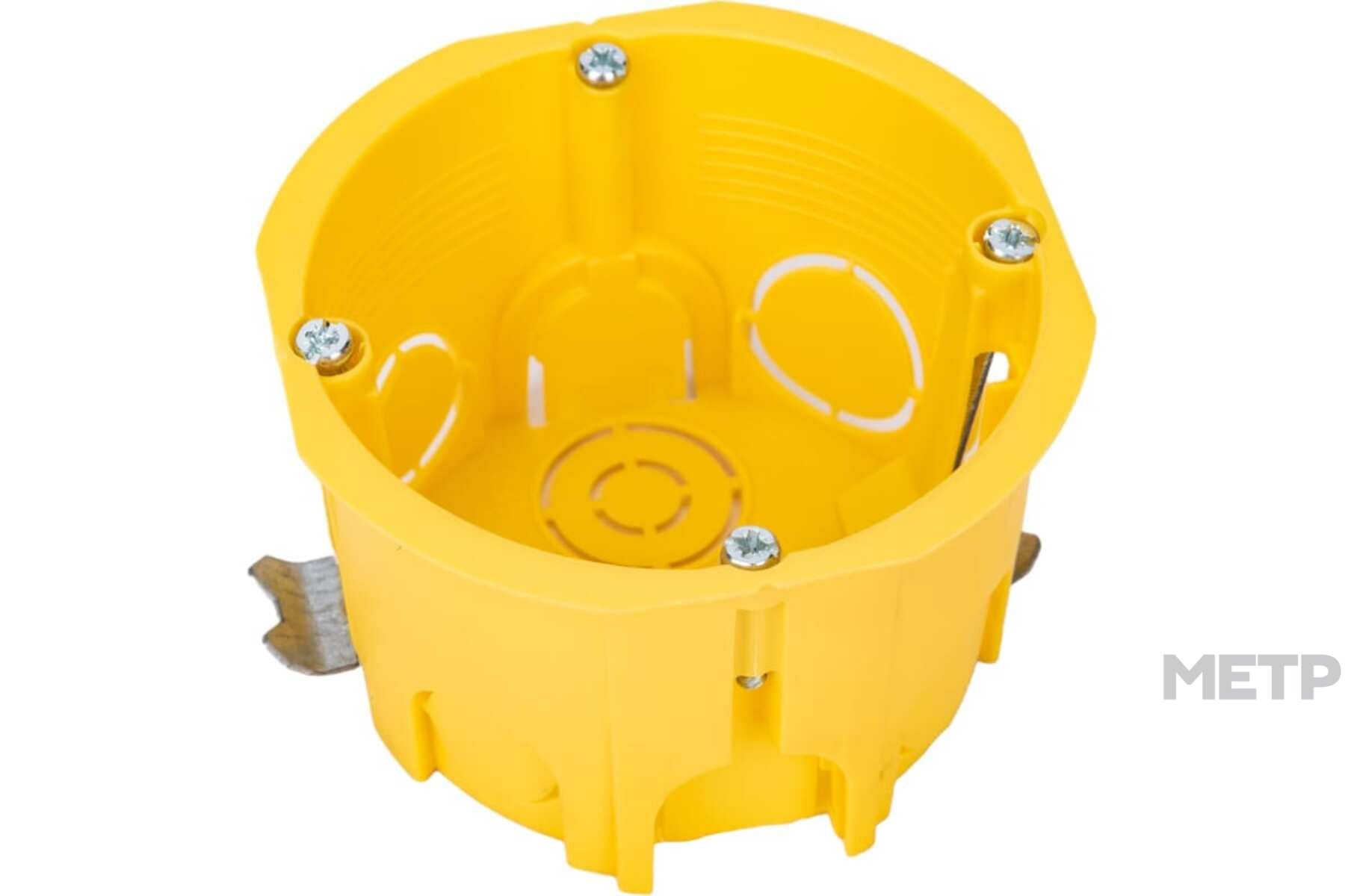 Коробка установочная Schneider Electric d65х45мм, арт. IMT35150 созданна для монтажа в гипсокартон. Её яркий жёлтый цвет хорошо виден на поверхности, что упрощает разметку. При глубине 45 мм и диаметре 65 мм внутри комфортно разместятся провода и механизм розетки или выключателя. Коробка имеет 8 вводов для подвода кабеля с разных сторон, что даёт гибкость при планировании проводки. Сделана в России, соответствует высоким стандартам качества бренда. Идеальный выбор для аккуратного и безопасного монтажа электроточки в гипсокартонной стене.