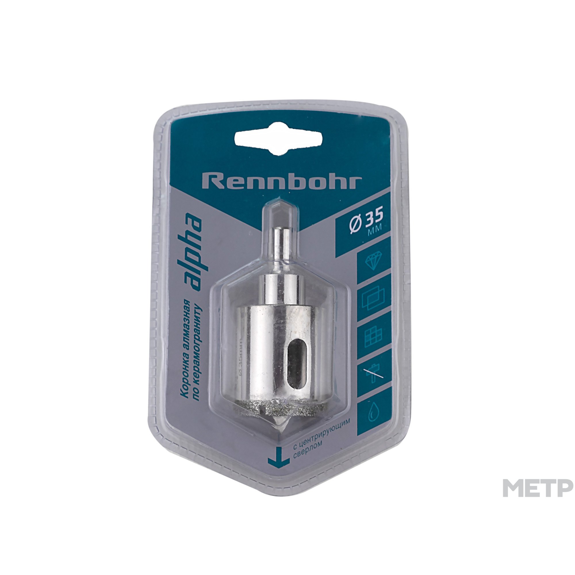 Коронка RENNBOHR Alpha 35 мм по керамике отличается высокой режущей способностью и износостойкостью. При помощи инструмента можно аккуратно вырезать круглое отверстие, не повредив строительный материал. Часто такая работа выполняется в ванной комнате, когда осуществляется прокладка коммуникаций.