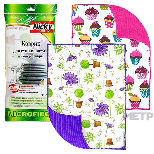 Коврик для сушки посуды (38х51 см) из микрофибры. Инновационный материал имеет в своей основе тончайшие синтетические волокна. Изделие станет хорошим помощником при мытье посуды, не вызывает аллергии при использовании, полностью соответствует стандартам экологической безопасности.