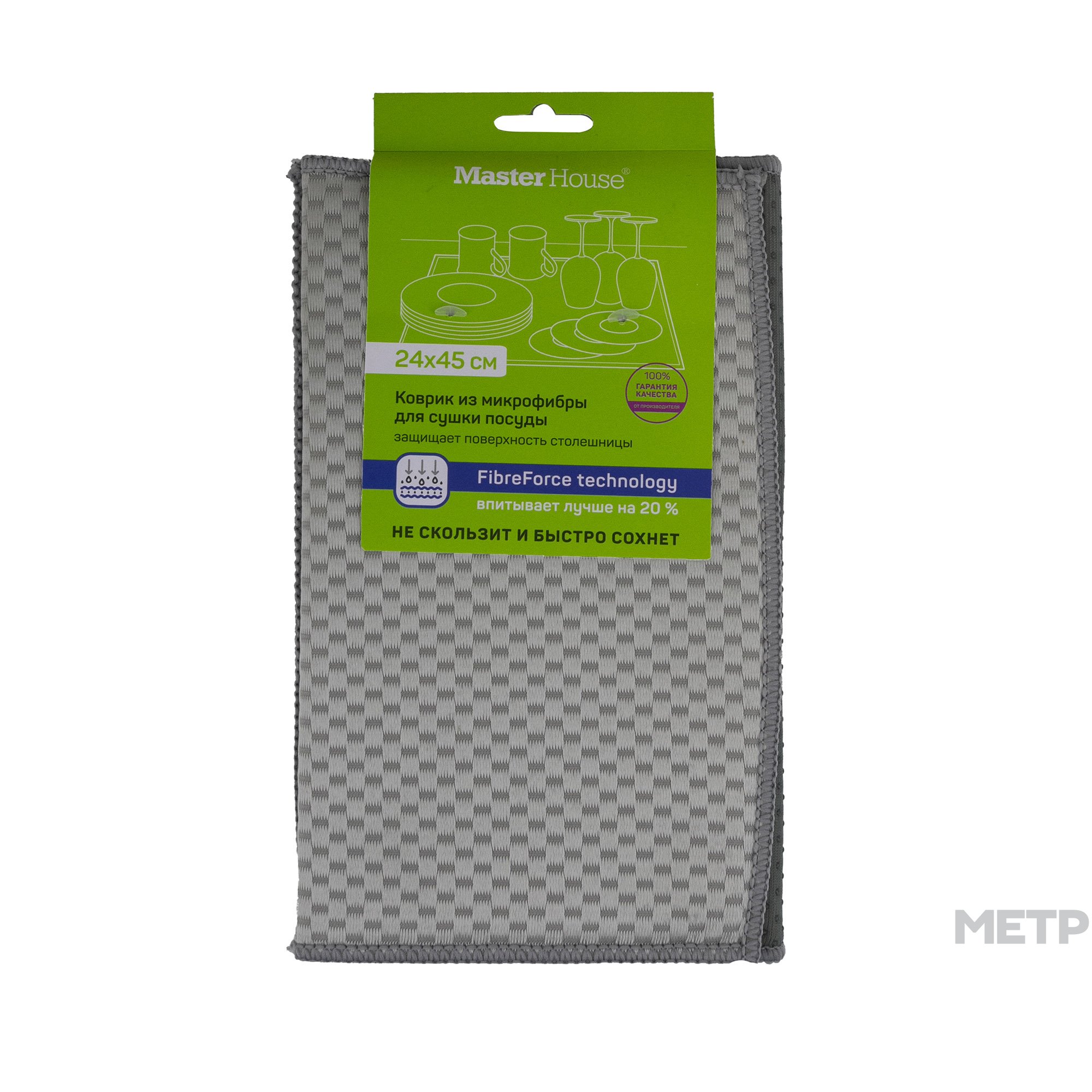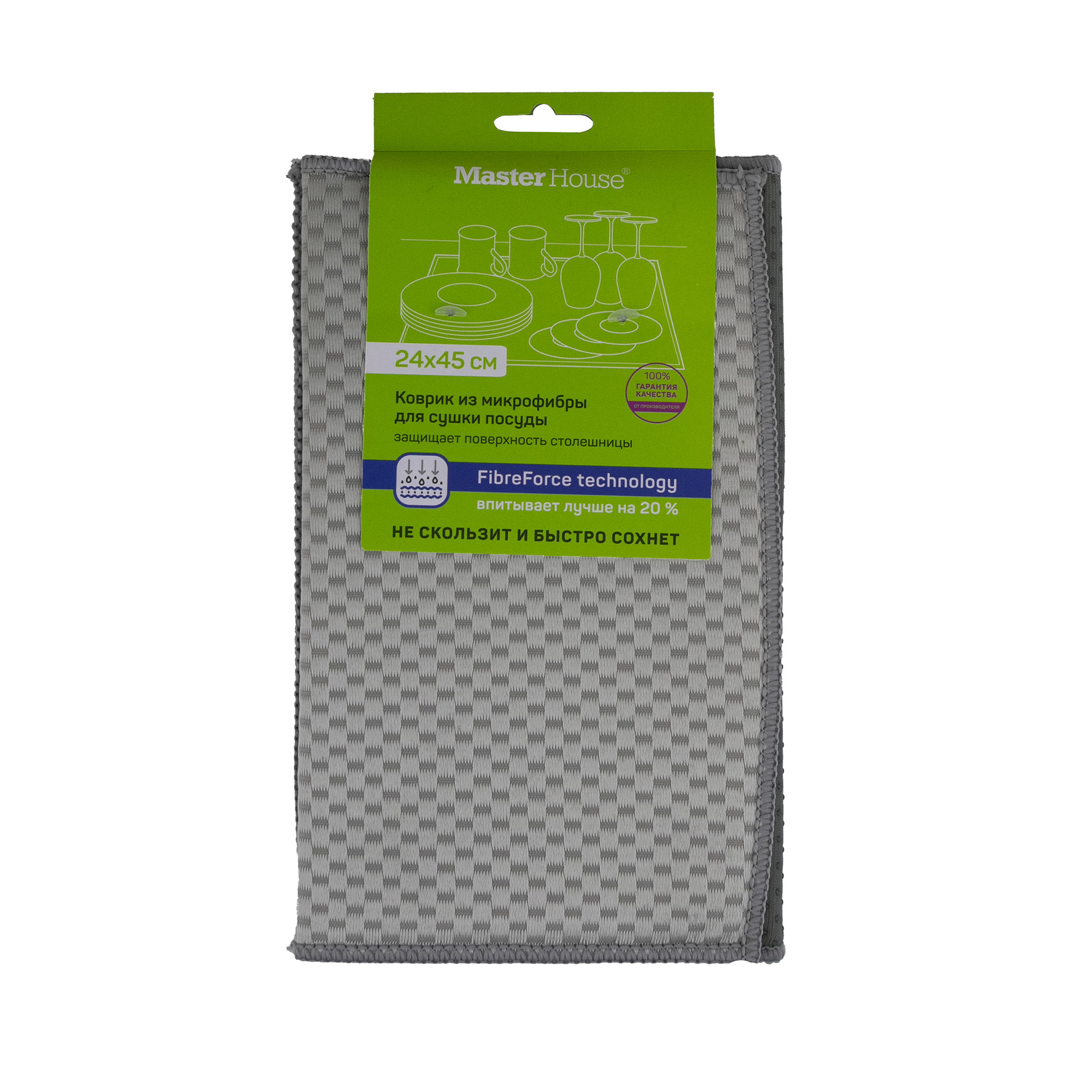 Коврик для сушки посуды из микрофибры. Не скользит, легко отжимается, отлично впитывает воду, защищает столешницу. Материалы: полиэстер 100%, поролон. Упаковка : картон, европодвес