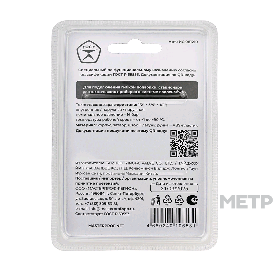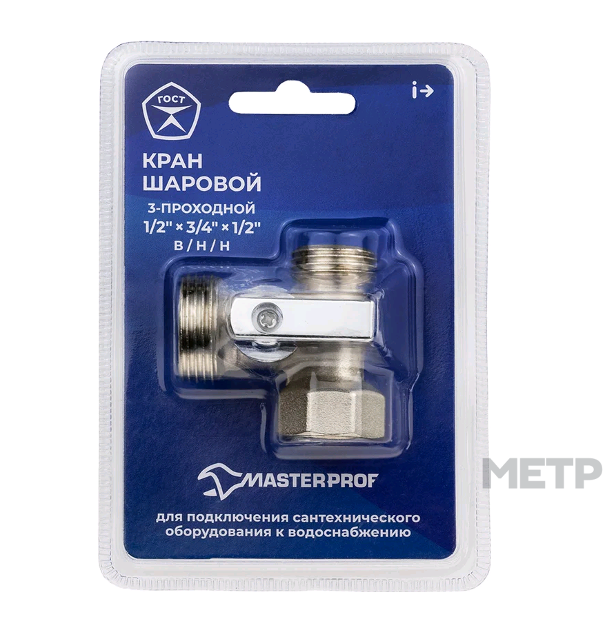 Кран шаровой трёхпроходной для бытовой техники, предназначен для подключения гибкой подводки, стационарных и сантехнических приборов (смесители, сливные бачки, душевые лейки, биде, стиральные машины, посудомоечные машины, водонагреватели, системы очистки воды и т.п.) в систему трубопровода с целью перекрытия потока рабочей среды при их обслуживании, ремонте или предотвращения аварийной ситуации, сохраняя при этом водоснабжение в помещениях на остальных участках водопровода. Использование шарового крана в качестве регулирующей арматуры не допускается.