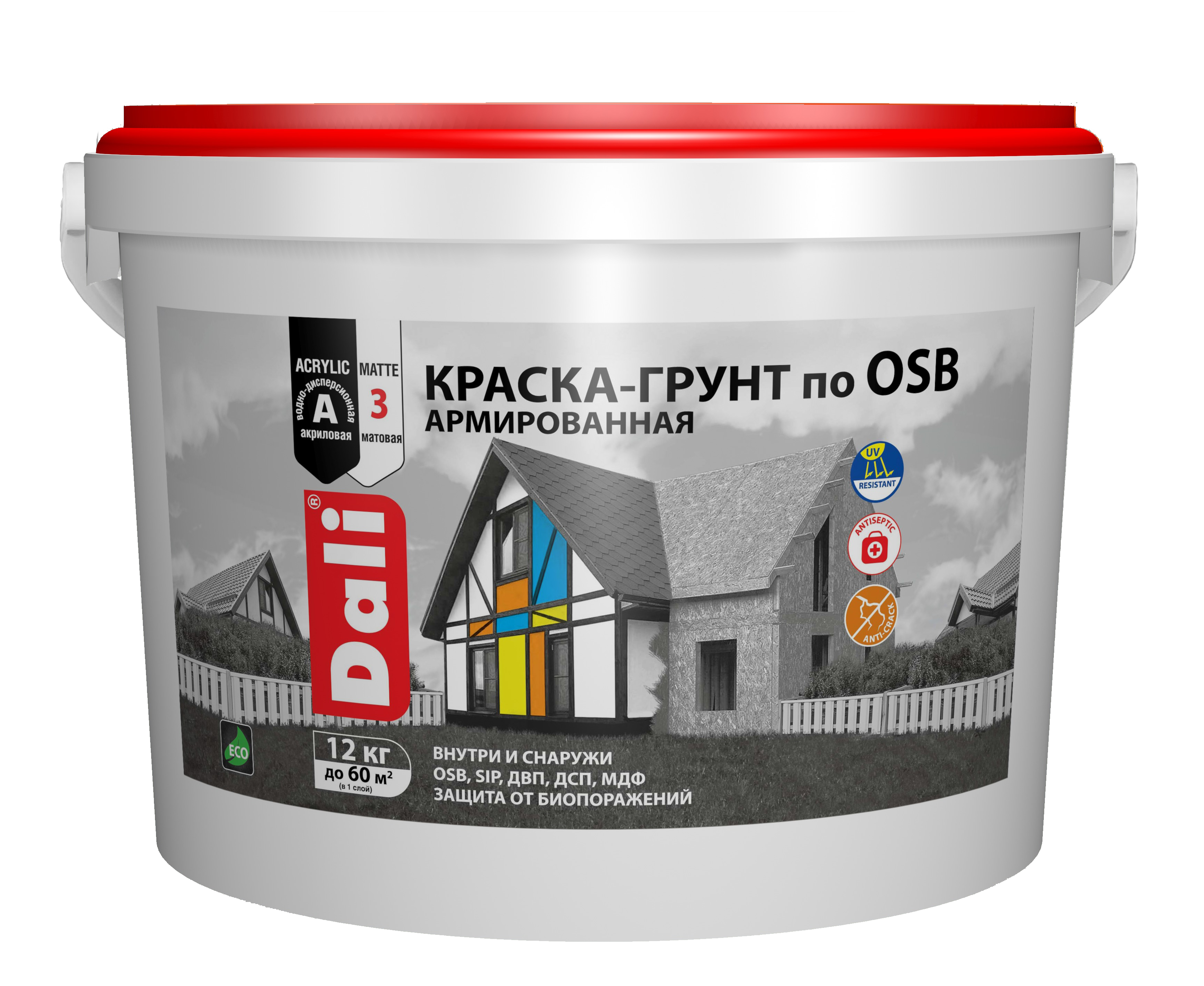 Краска-грунт Dali по OSB, армированная, основа А, 6 кг используется в качестве грунта: подготовка поверхности к последующей финишной отделке; снижение расхода финишного покрытия; увеличение срока службы финишного покрытия; выравнивание впитывающей способности основания; повышение адгезии финишного покрытия; а также в качестве финишного покрытия: защитно-декоративная обработка фасадов, стен, потолков, архитектурных элементов и прочих поверхностей. Применяется снаружи и внутри помещений, отапливаемых и неотапливаемых, в том числе с повышенной эксплуатационной нагрузкой и влажностью воздуха: по OSB-плитам любого класса, SIP-панелям, ДСП, ДВП, фанере, МДФ, фибролитовым и цементно-стружечным плитам в соотвествии с их областью применения; по минеральным основаниям (бетон, цемент, штукатурка, кирпич, камень и пр.), в том числе по асбестоцементным плитам и шиферам.; по любым деревянным поверхностям (брус, бревно, вагонка, блок-хаус, имитация бруса и пр.); по ГКЛ, ГВЛ и пр.