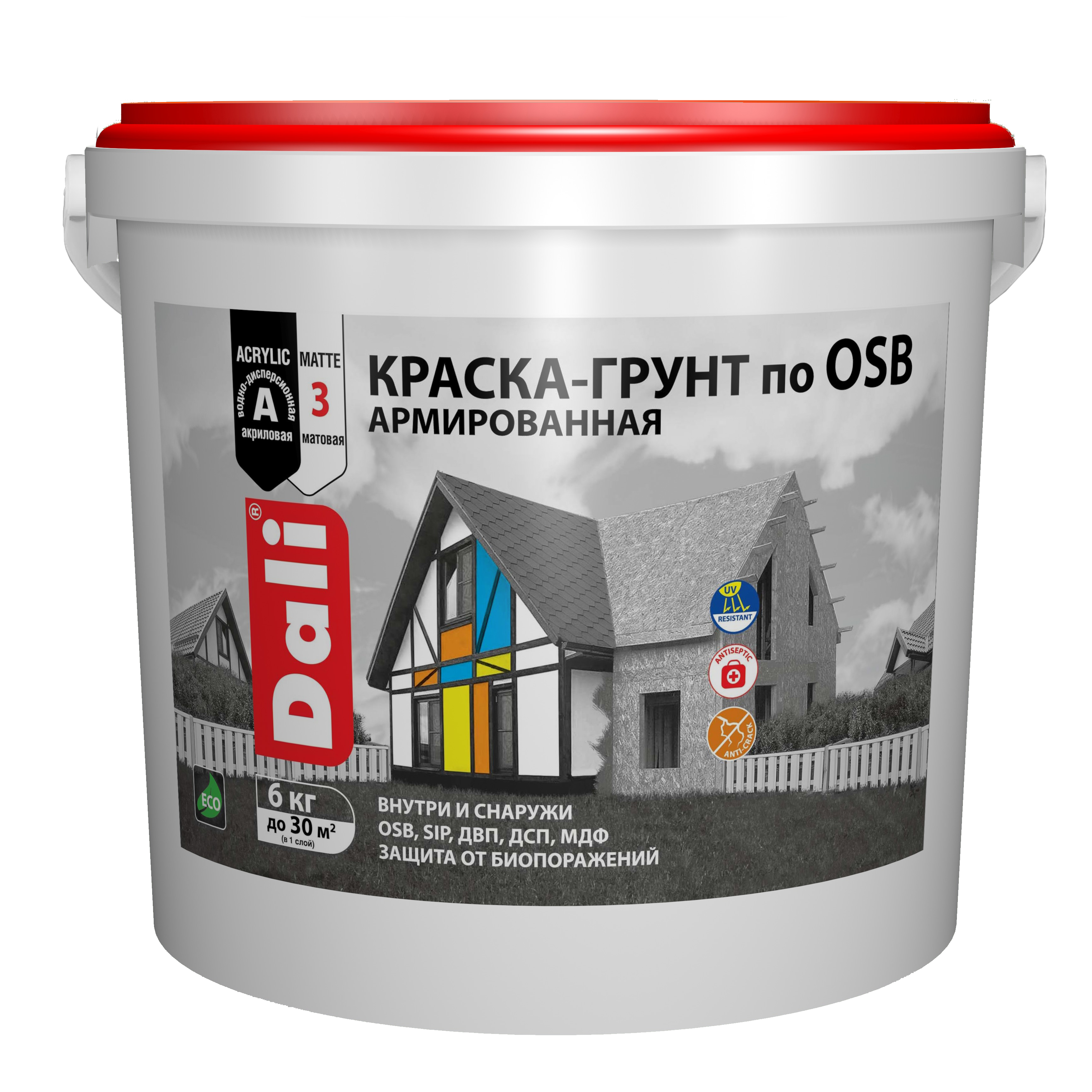 Краска-грунт Dali по OSB, армированная, основа А, 6 кг используется в качестве грунта: подготовка поверхности к последующей финишной отделке; снижение расхода финишного покрытия; увеличение срока службы финишного покрытия; выравнивание впитывающей способности основания; повышение адгезии финишного покрытия; а также в качестве финишного покрытия: защитно-декоративная обработка фасадов, стен, потолков, архитектурных элементов и прочих поверхностей. Применяется снаружи и внутри помещений, отапливаемых и неотапливаемых, в том числе с повышенной эксплуатационной нагрузкой и влажностью воздуха: по OSB-плитам любого класса, SIP-панелям, ДСП, ДВП, фанере, МДФ, фибролитовым и цементно-стружечным плитам в соотвествии с их областью применения; по минеральным основаниям (бетон, цемент, штукатурка, кирпич, камень и пр.), в том числе по асбестоцементным плитам и шиферам.; по любым деревянным поверхностям (брус, бревно, вагонка, блок-хаус, имитация бруса и пр.); по ГКЛ, ГВЛ и пр.