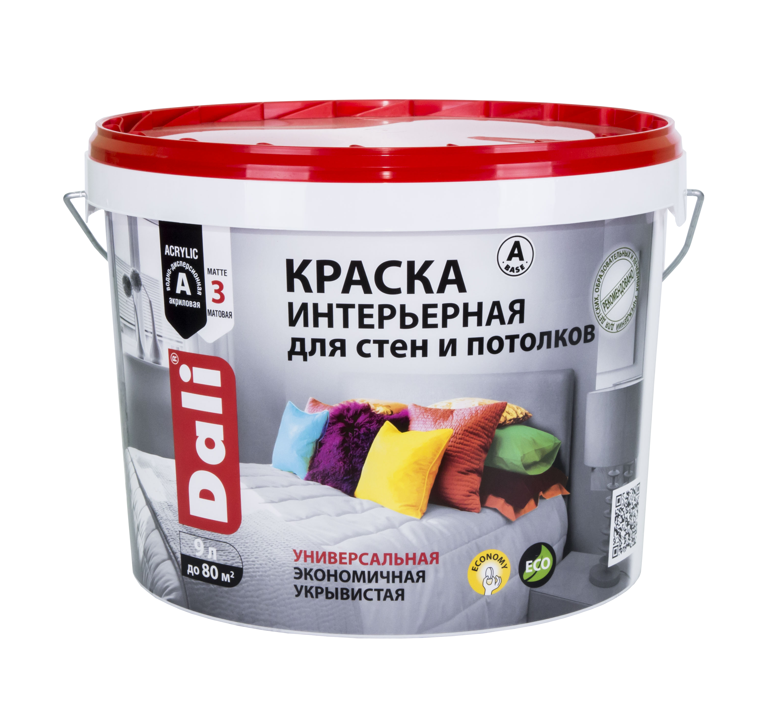Краска ВД Dali интерьерная белоснежная основа А, 9 л предназначена для декоративного окрашивания стен и потолков в жилых и общественных помещениях с нормальной эксплуатационной нагрузкой. Свойства: образует идеально гладкое глубокоматовое шелковистое покрытие устойчива к сухой или легкой влажной уборке; легко наносится, равномерно распределяется по поверхности универсальная: подходит для окрашивания стен, потолков и обоев; образует паропроницаемое («дышащее») покрытие; не желтеет и не теряет цвет в процессе эксплуатации; не мелит; не имеет неприятного запаха.