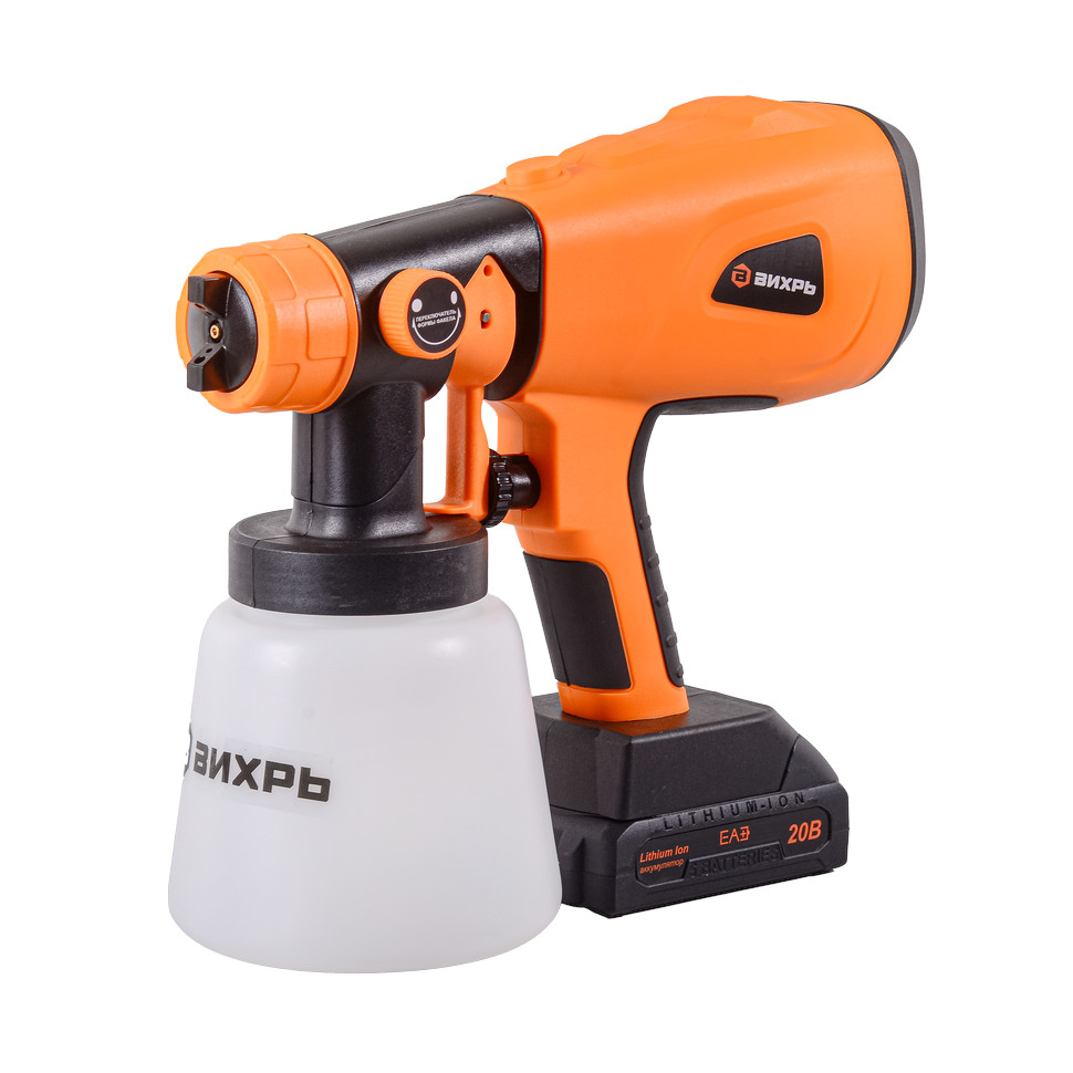 Краскопульт аккумуляторный АКП-20Li Вихрь – это портативный инструмент, который предназначен для быстрой и качественной обработки поверхностей лакокрасочными материалами. Модель оснащена литий-ионной батареей с напряжением 20 В и емкостью 3 А·ч, а также зарядным устройством, что дает возможность использовать его независимо от электросети. Это особенно полезно при выполнении работ на открытом воздухе или в местах с ограниченным доступом к электричеству. Батарея совместима с системой EA+ (единой аккумуляторной платформой), что повышает универсальность использования.Небольшой вес и удобная ручка позволяют комфортно работать длительное время. Бачок объемом 1 литр рассчитан на длительную непрерывную эксплуатацию. Краскопульт подходит для работы с разными типами жидкостей, такими как краска, лак, морилка, грунтовка и прочие составы с вязкостью до 80 DIN. Производительность достигает 800 мл/мин.Форма факела регулируется с помощью переключателя и поворота распылительной головки, что позволяет адаптироваться к различным условиям работы. В набор входят три сопла диаметром 1 мм, 1.8 мм и 2.5 мм, что расширяет возможности применения устройства.