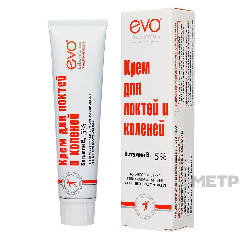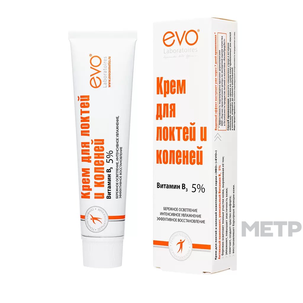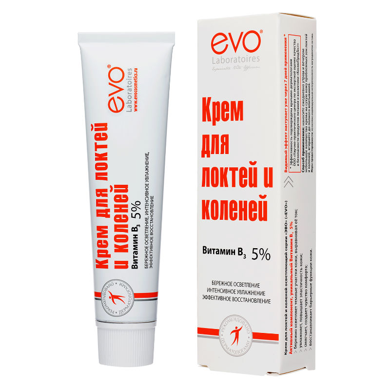 Крем для локтей и коленей Evo Осветляющий 46 мл при регулярном использовании за неделю уменьшает проявления гиперкератоза кожи на коленях и локтях (шелушение, сухость, огрубение и потемнение кожных покровов). Состав крема содержит оптимальную концентрацию витамина В3 для быстрого восстановления здорового цвета кожи и эффективной защиты покровов от агрессивных факторов окружающей среды. Мочевина способствует длительному увлажнению и обновлению кожи, смягчает ее поверхность, устраняет трещины и шелушения.
